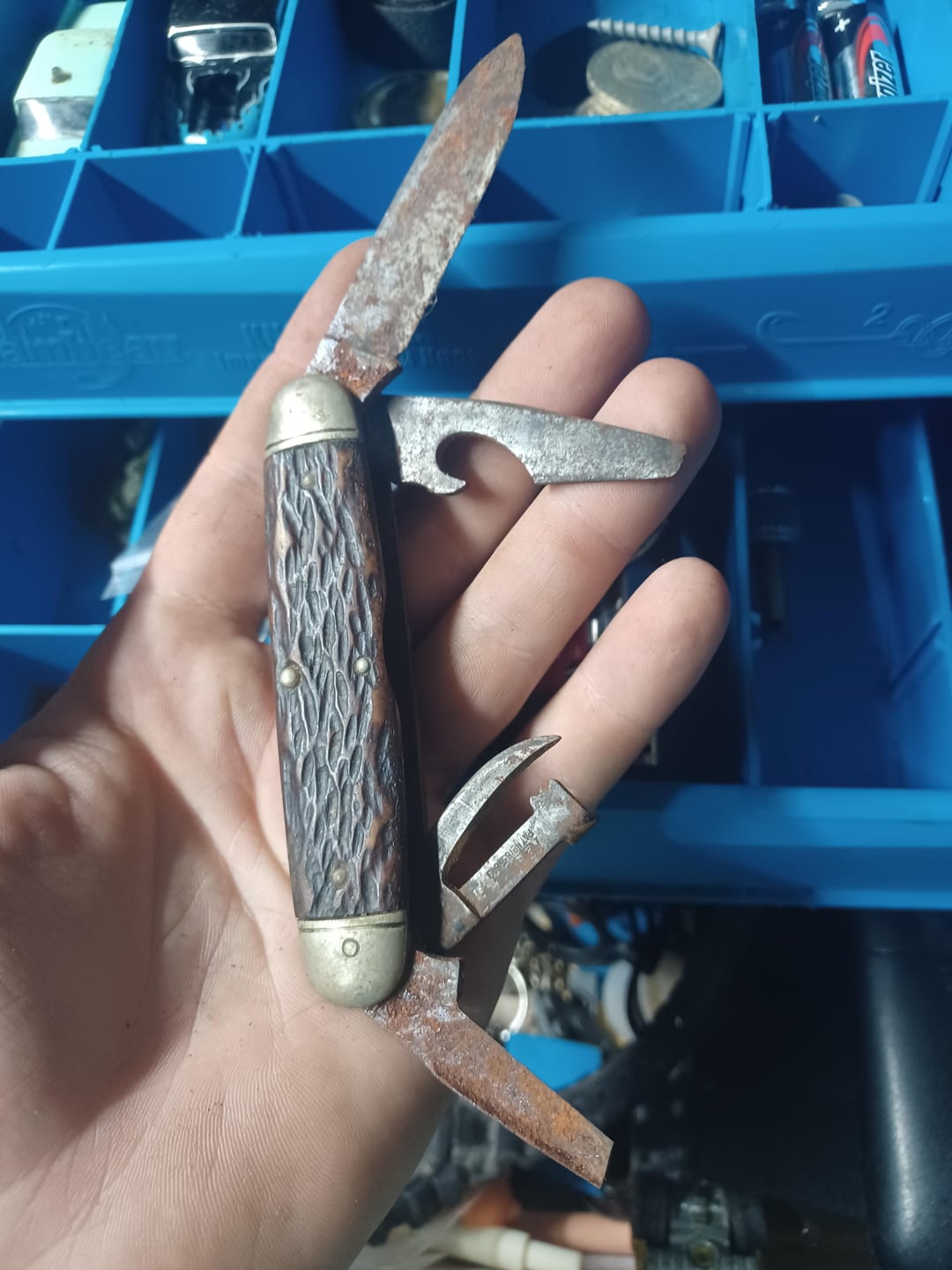 2. The top blade is the utility blade. Lower is a bottle opener/ screw driver. Third is a can opener. Bottom is a broken blade I’d use to clean my nails.