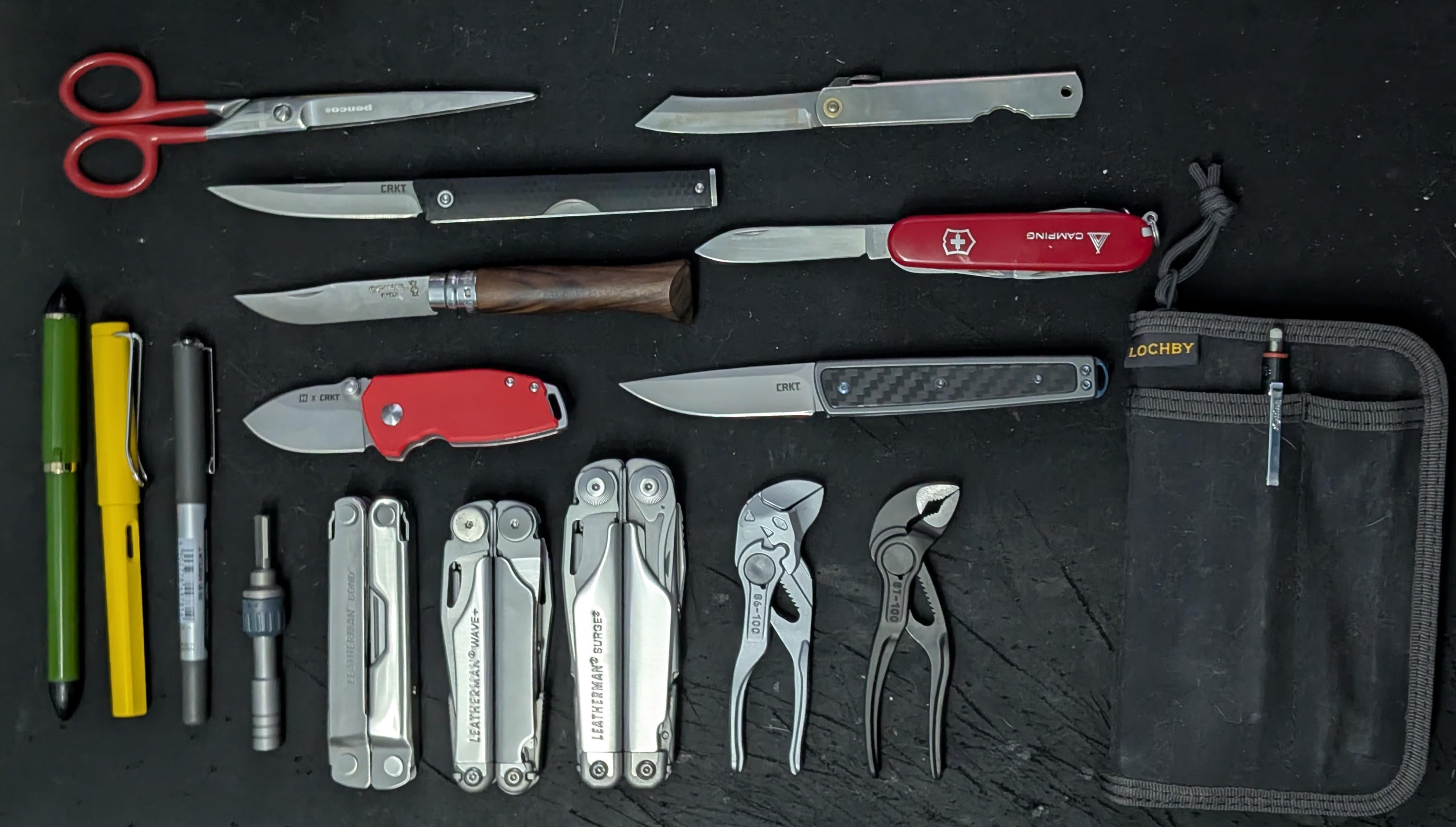 LM Surge, LM Wave+, LM Bond, Crkt CEO, Crkt symmetry, Crkt squid, opinel no.6, higonokami, Swiss army knife, Knipex mini cobra x2, lochby pocket journal, lamy safari, Sailor fude de mannen, uniball eye.