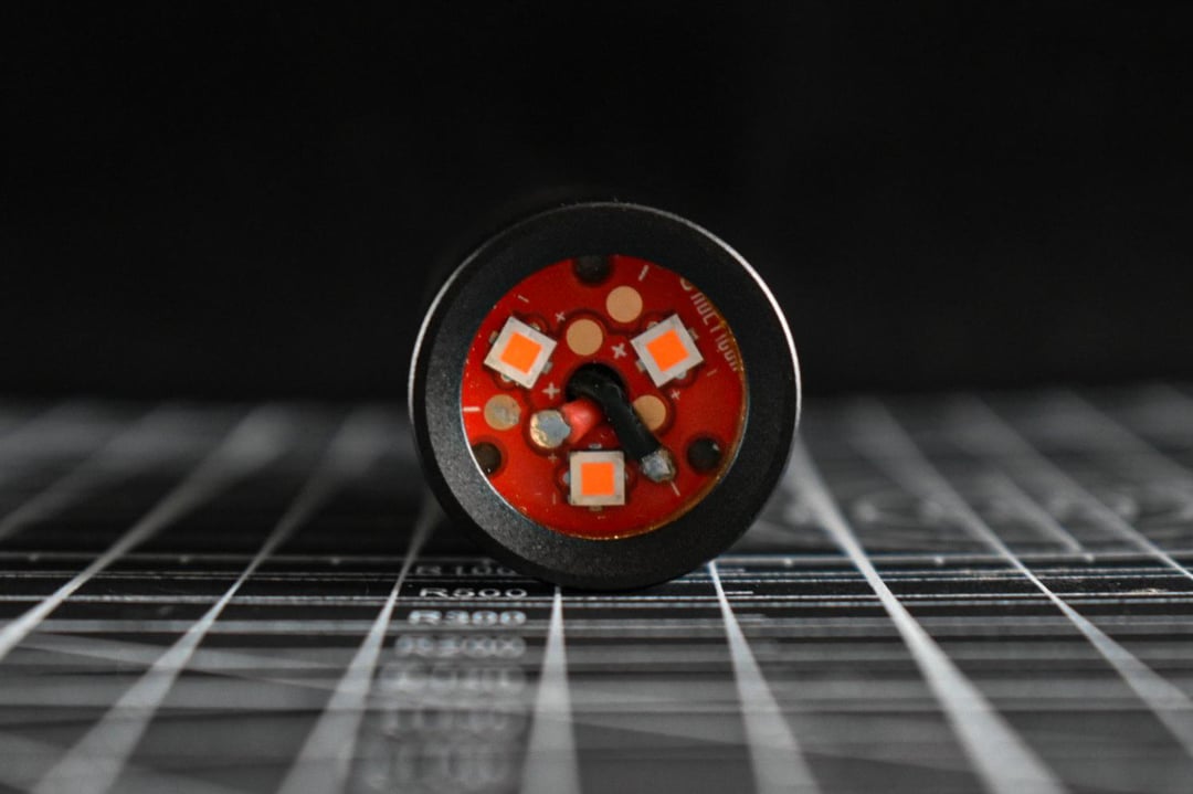 This Noctigon MCPCB is meant to be used with optics. So, as a mule, the placement of the emitters makes a cool flower geometric pattern at extremely close range. This is not visible at all when using 'as normal'.