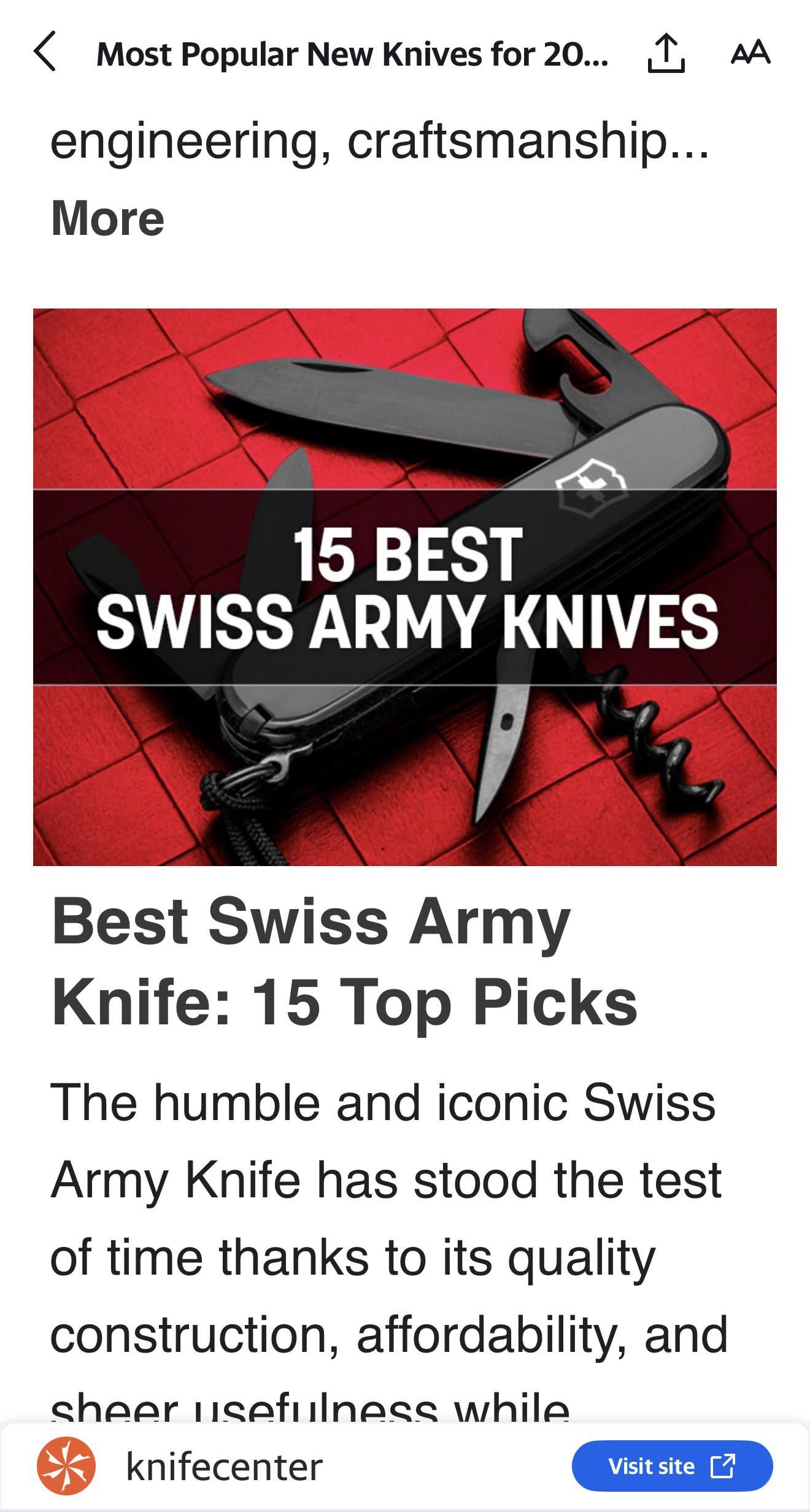 This is annoying. This afternoon (12/23/25) I got one of the daily Knife Center emails. In the email, they almost always have links to lists of various knives. Great. Today, one of the lists was, “Best Swiss Army Knife: 15 Top Picks” and at the top has a picture of an all blacked out (absolutely gorgeous) knife. I click on the link (below), and it takes me to a list made in 2024, and nowhere says what the model is, or links to the product. WTF!? (For those who are curious, it’s the Victorinox Onyx Black Spartan Swiss Army Knife… and when I searched on KC’s website, the are out of stock). 🤦‍♂️