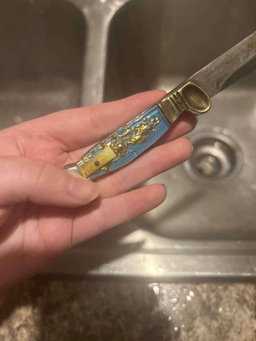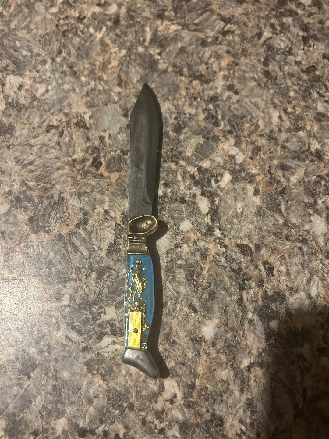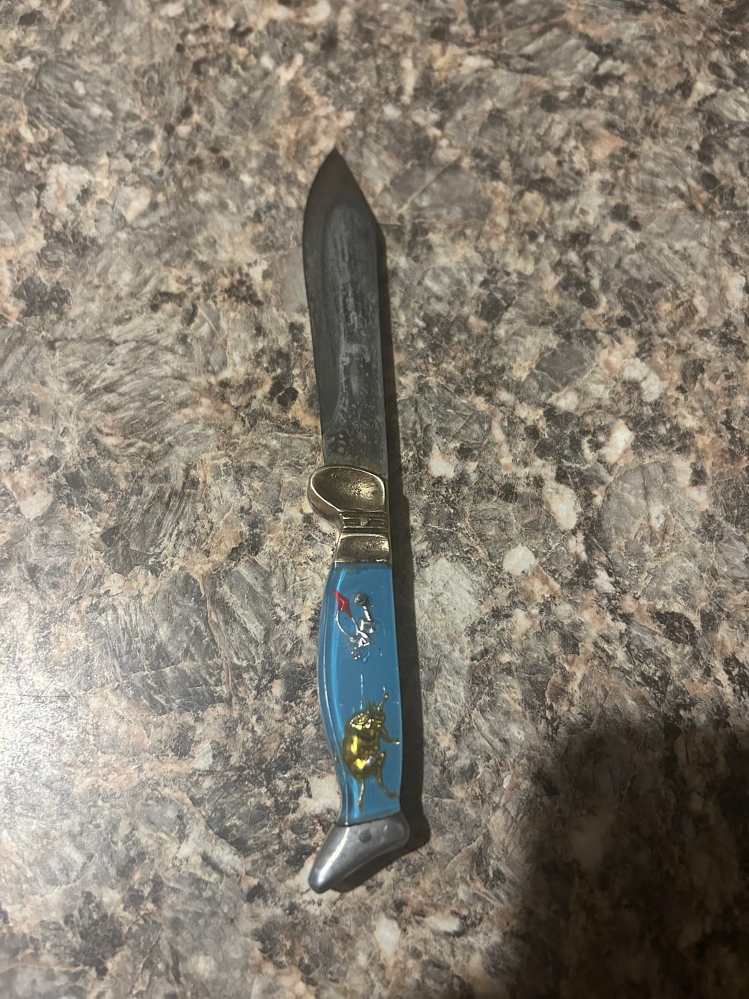 Previous owners of my house left it, found one online with the same handle but it was a switch blade and that one was $180, I used vinegar to remove rust off of it and accidentally made the blade dark 🙁 hoping that’s fixable though. I feel bad I hope I didn’t ruin it. I also hope it’s not expensive so I didn’t potentially ruin an expensive knife and because if it’s expensive I’m gonna wanna give it back to the previous owners.