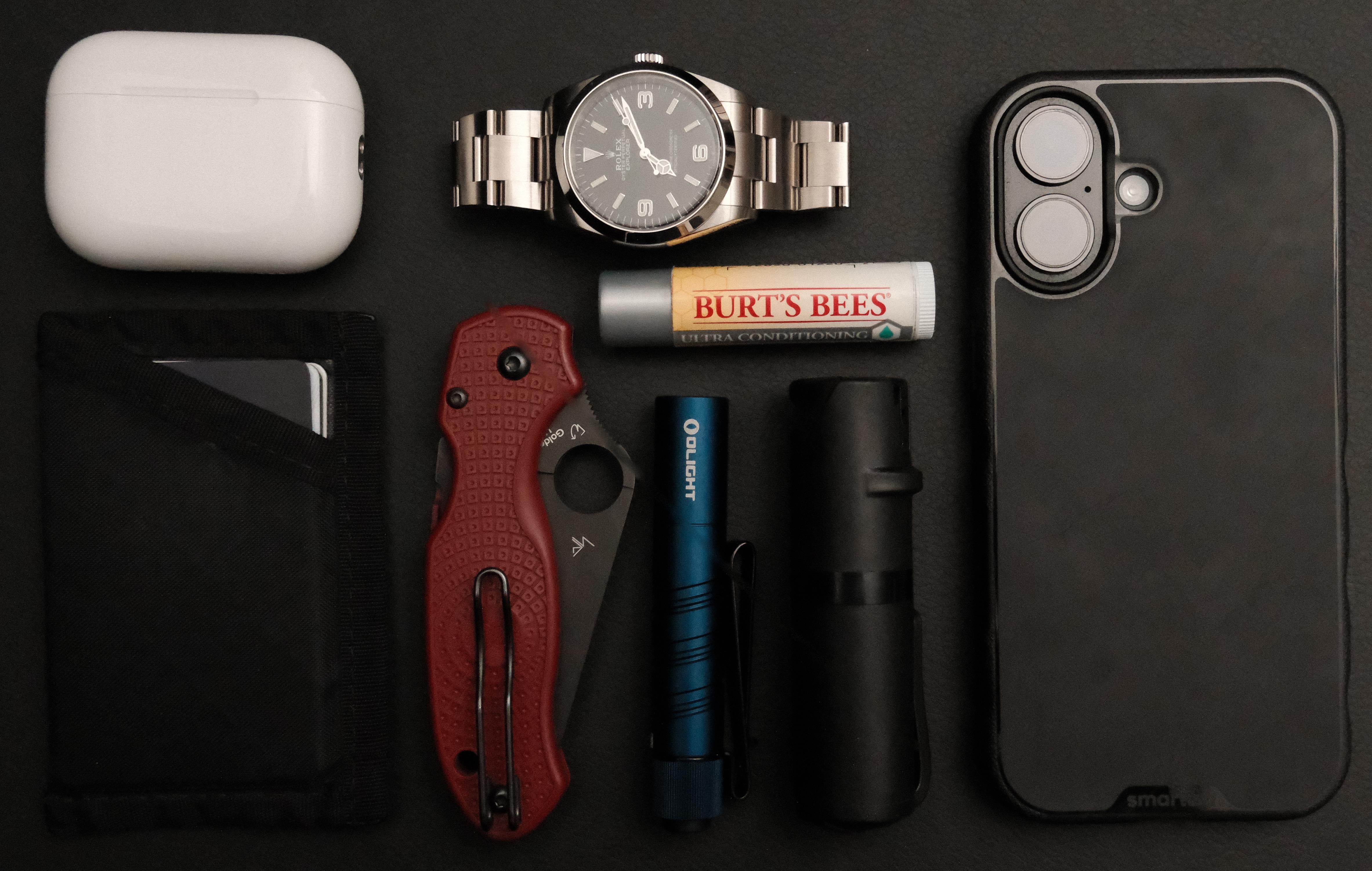 From top-left: Apple AirPods Pro 3, Rolex Explorer 36, Burt's Bees, Apple iPhone 17 in a Smartish Gripmunk, POM clip, OLIGHT I3T 2, Spyderco Para 3 lightweight in CPM 4V, de-tagged Flowfold RFID blocking minimalist Card Holder
