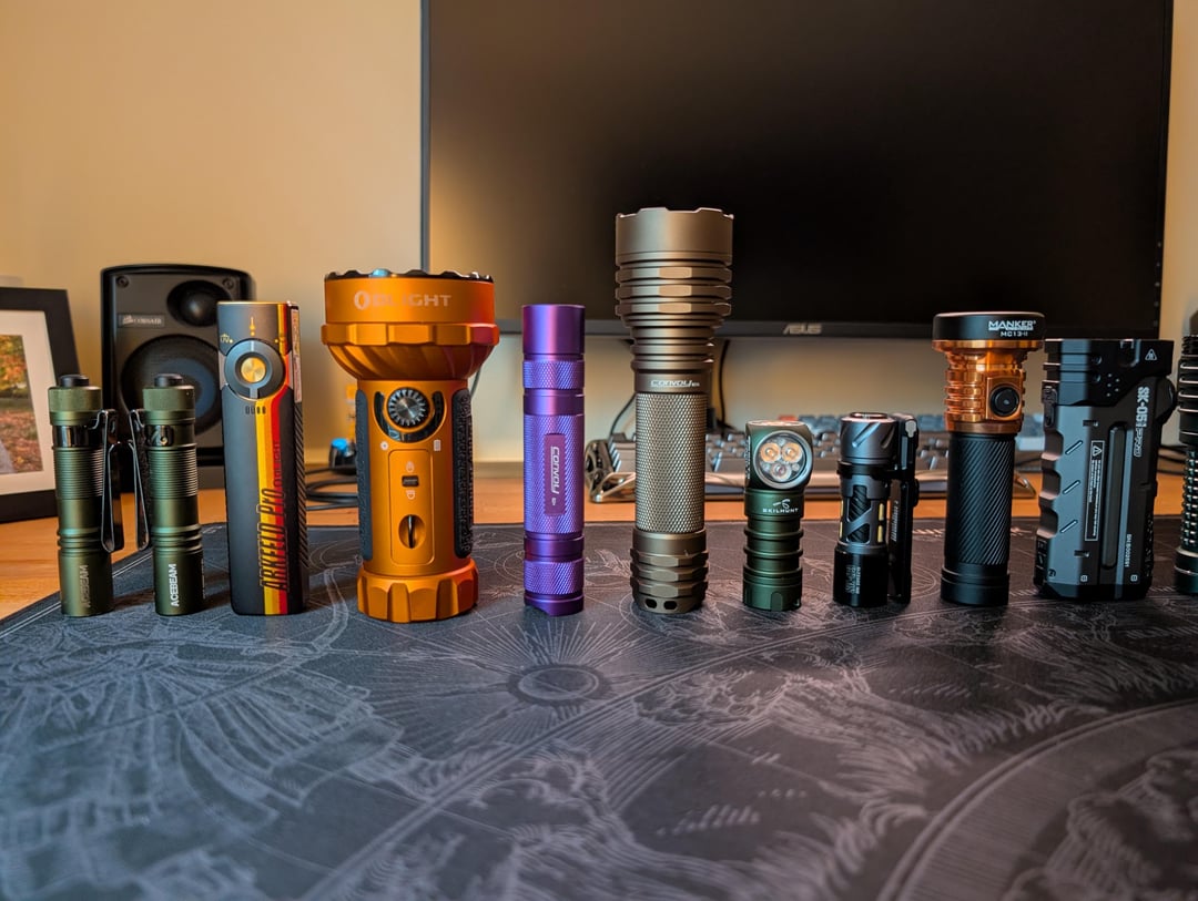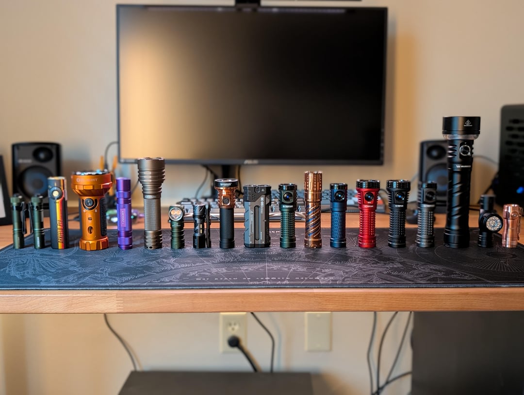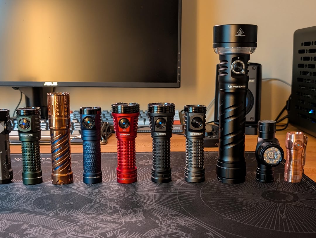 Most impressive light(s): The Wurkkos TS27 is such an impressive device. You've got throw, flood, down firing lantern, a hilariously large battery, RGB (if you ever use it), USB-C with powerbank functionality, tank-like build quality, and a very fair price. The FFL E04 Surge with the SFT42 is stupid bright for the size, with a good combination of throw and flood. It's my second brightest aside from the Marauder Mini.