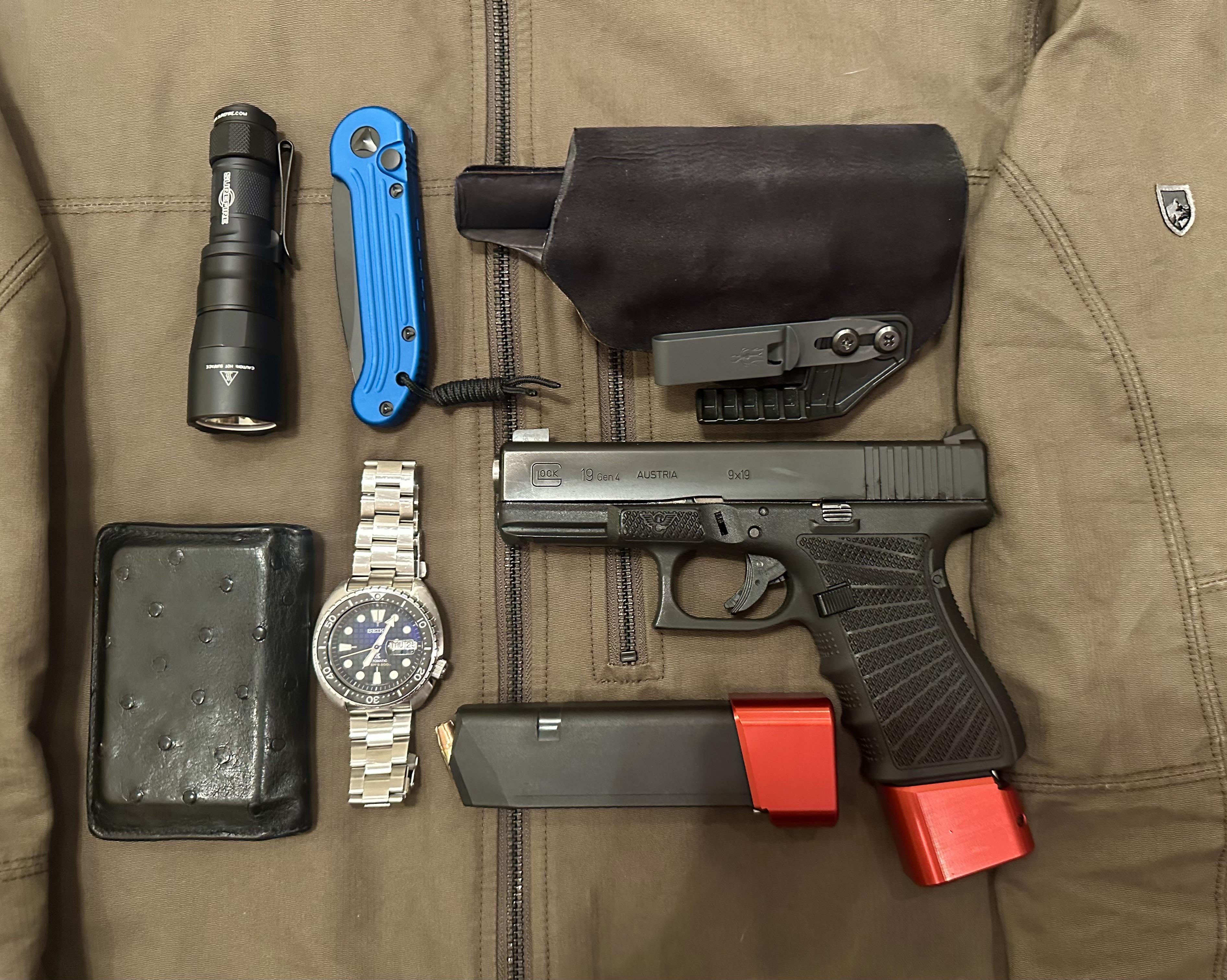 In EDC Winter Pocket Dump December 26, 2025 Wilson Combat Paul Howe Glock 19 (2 TTI +5 extenders loaded with Hornady subsonic rounds)Phalanx Concealment leather lined kydex holsterSurefire EDC1-DFT TurboMicrotech LUDTLouis Vuitton Ostrich WalletSeiko King Turtleby oinkmate EDC Prev Post Today’s carry December 26, 2025 Next Post The wife really came through! December 26, 2025 Related Posts Pocket Dump EDC / Whittle January 14, 2026 EDC Finally Dialed in January 14, 2026 Happy Wednesday all. . . Timex Expedition and Civivi Guile January 14, 2026 1 Comment AutoModerator 3 weeks ago Thank you for posting to r/EDC! Include a detailed item list (make/model) within **1 hour** of submission. Lists can go in the title, a comment, or the image. Posts without lists will be removed. If you have already provided a list, not further action is needed, thanks | [FAQ](https://www.reddit.com/r/EDC/wiki/faq)*I am a bot, and this action was performed automatically. Please [contact the moderators of this subreddit](/message/compose/?to=/r/EDC) if you have any questions or concerns.*Write A CommentYou must be logged in to post a comment.