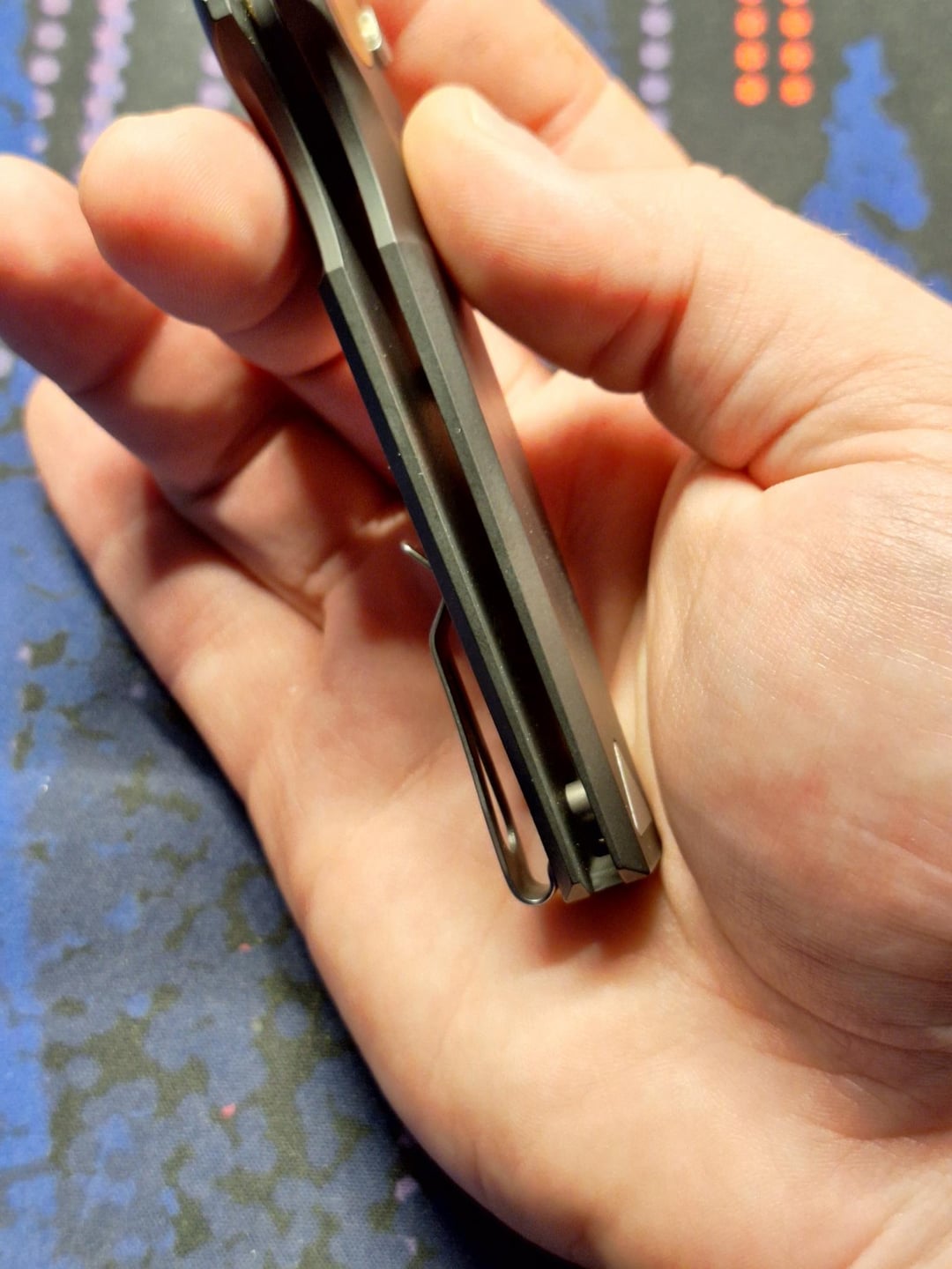 Pocket Clip : Too big, geometry snags on pants when removing from pocket. This could definitely be made smaller. This pocket clip is something I would expect to find on a knife that weighs 6-8 ounces, not 2.4 ounces.