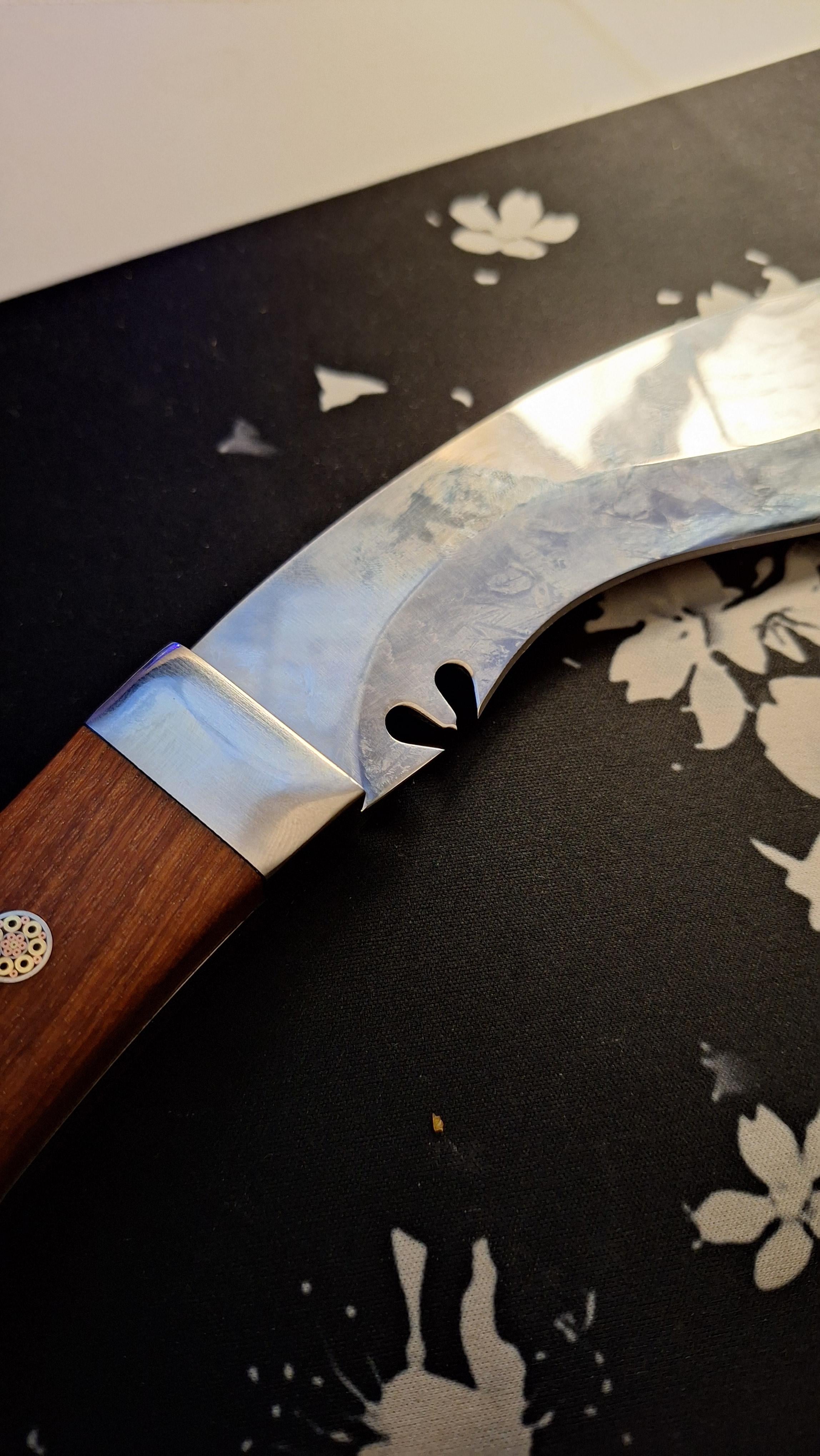 That’s a cool gift! That notch is called a Cho or a Kaudi. There is no historical record that specifically describes a single purpose but there are several traditional and practical explanations for them. Historians believe it could have religious relevance. It could be a trident which symbolizes Shiva in Hindu religion. Some say it symbolizes a cow hoof as cows are sacred in India. There are also practical explanations that it works as sharpening stop or a blood or sap stop designed to keep the handle clean. Though these practical applications seem to be pretty heavily disputed by historians.