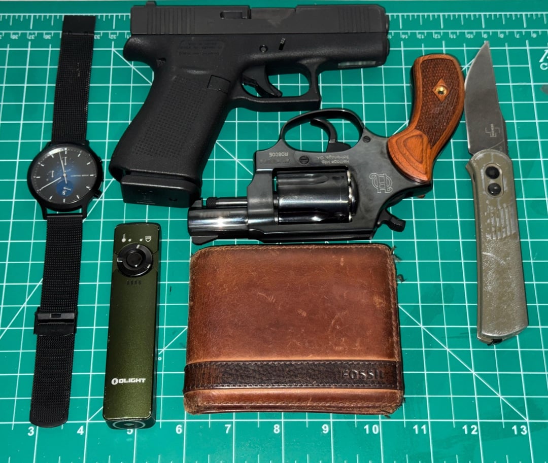 Personal: Glock 43X, Heritage Roscoe (rotate), Fossil wallet, Boker Alluvial automatic knife, Olight Arkfeld, Lilienthal Berlin Chronograph Meteorite, iPhone 15 Pro.