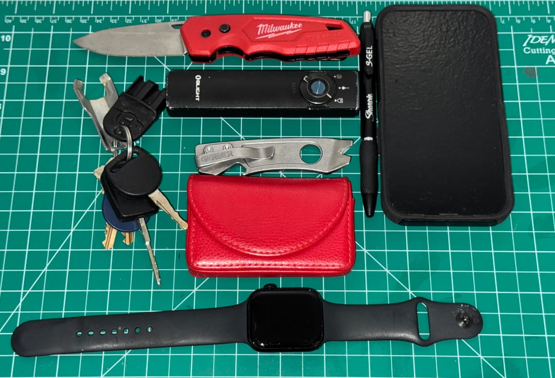 Work: Milwaukee pocket knife, Olight Arkfeld Pro, Gerber mini prybar, Sharpie S-gel, business card holder, Apple Watch SE gen 2, company iPhone 13, Keys (missing: Velo 9mg and Monster tea & lemonade).