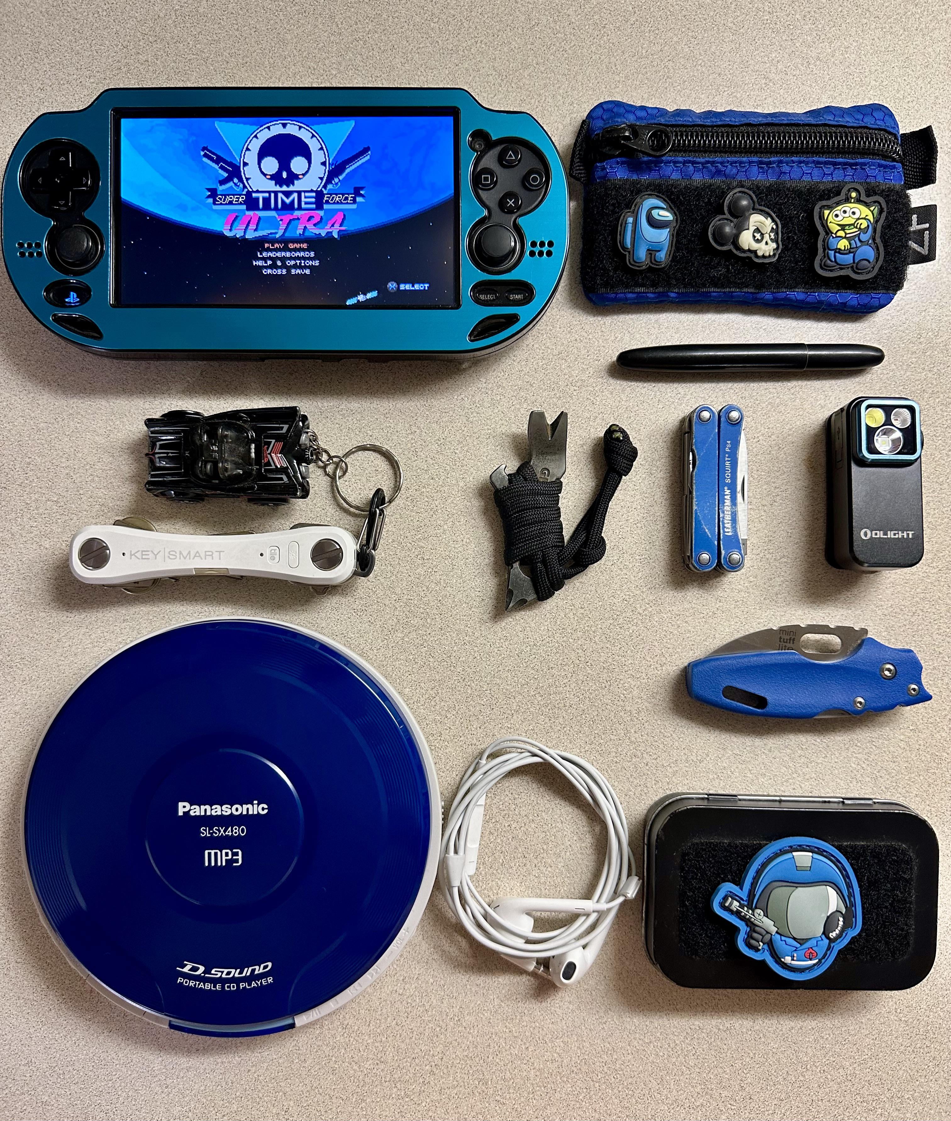 ZF pouch/wallet, wired EarPods, Cold Steel Mini Tuff Lite, storage tin, Panasonic SL-SX480 portable CD player with Metallica black album CD, KeySmart with Batmobile totem, Gerber Dime wrapped, Olight O clip Pro, LM Squirt Ps4, Fisher Space Bullet pen, PS Vita 1000