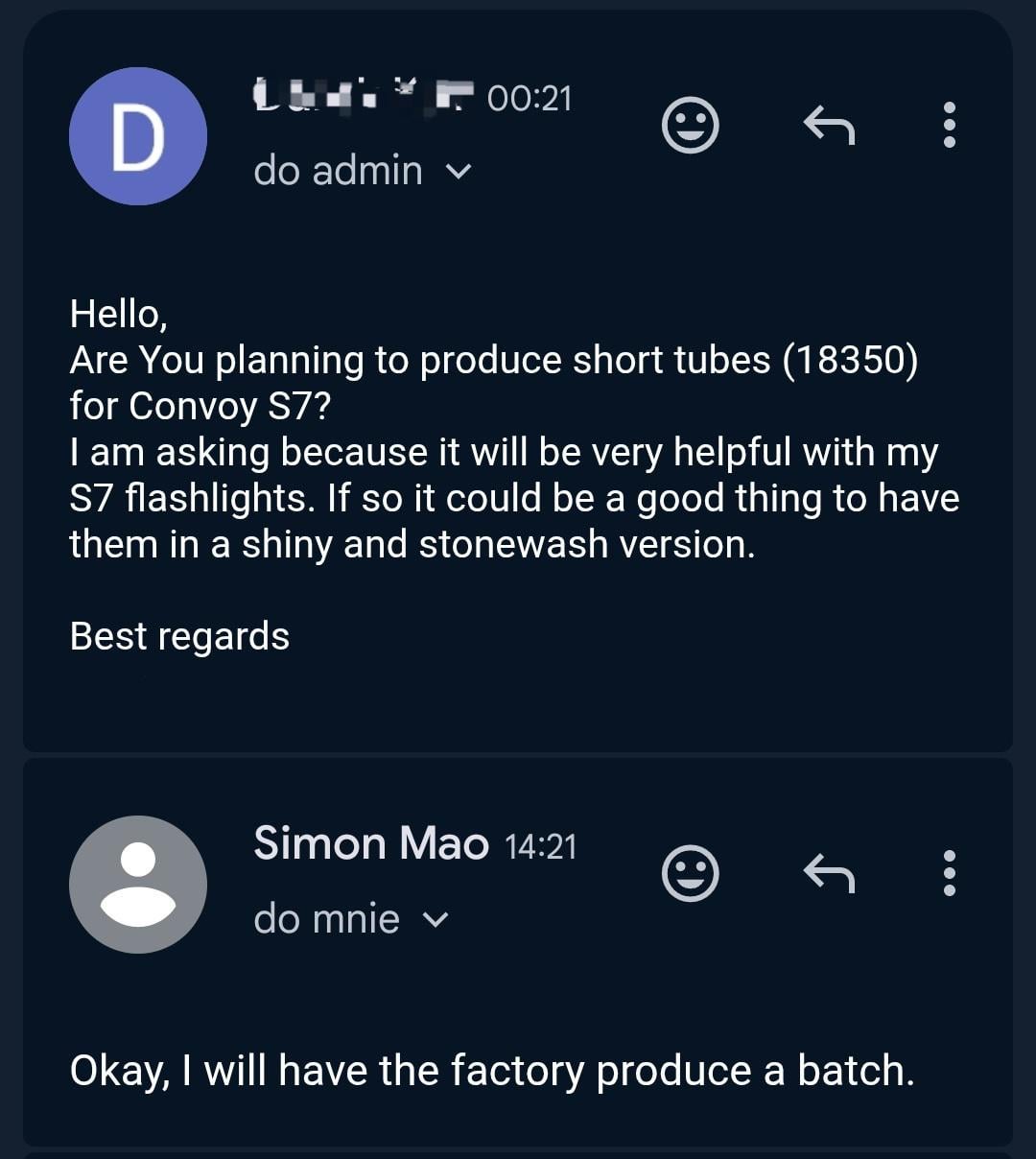 In Flashlight Short tubes for Convoy S7 incoming. And oh yeah Simon is awesome December 27, 2025 I just asked if Simon plan to produce short tubes for S7 and he said he will launch it. Simon is the bestby darek99 flashFlashlightlight Prev Post My Holiday Carry December 27, 2025 Next Post KA-BAR 1211 in 1095 steel December 27, 2025 Related Posts Emisar D4K vs Convoy S21E: did I choose the wrong emitter/driver? January 14, 2026 Lumintop F01 Clip Light: 1200LM Tested! January 14, 2026 2000K is wild January 14, 2026 1 Comment Wormminator 3 weeks ago Oh no my wallet!Write A CommentYou must be logged in to post a comment.