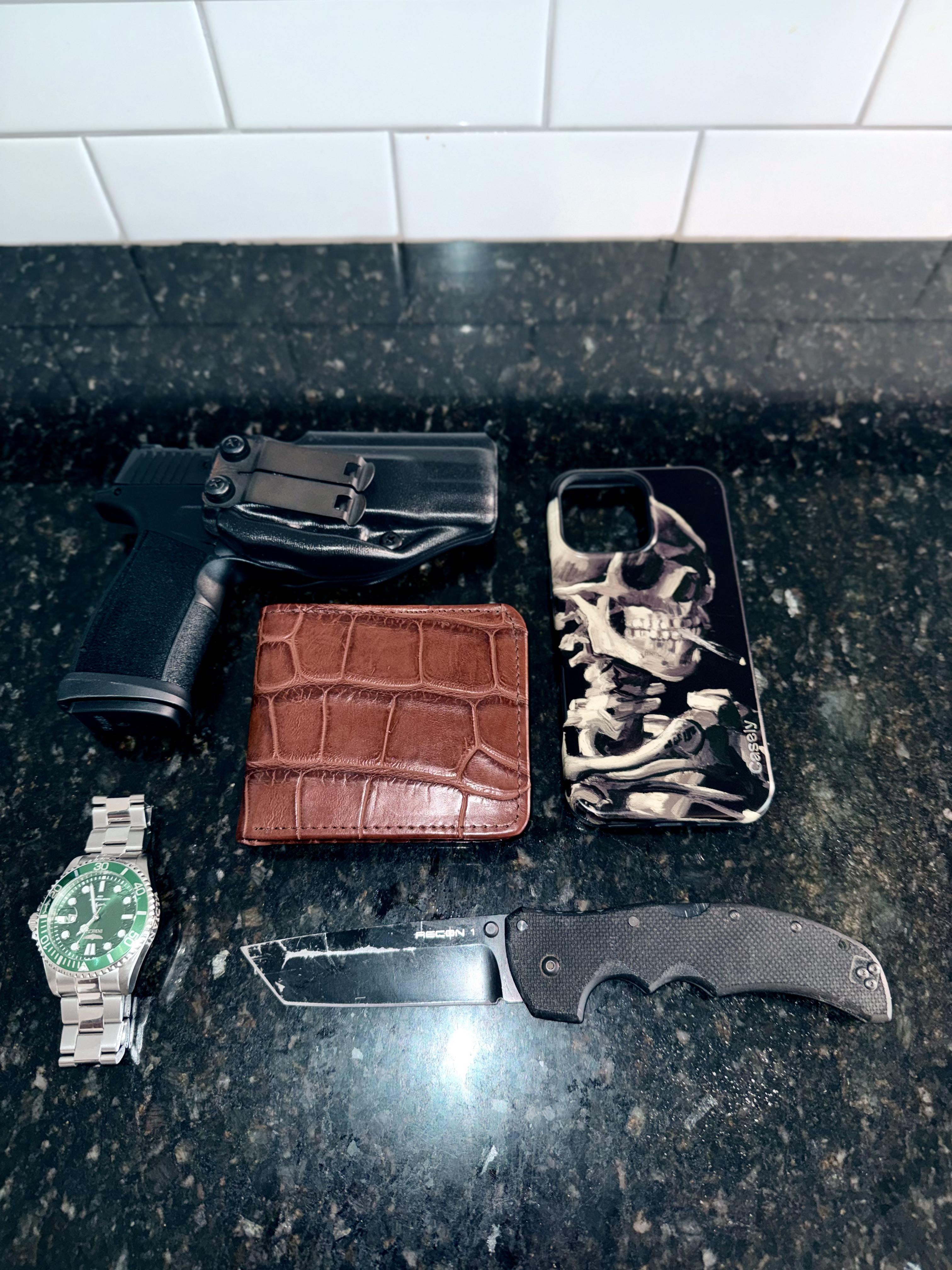 notagekynerd 3 weeks ago From Left to Right:Sig Sauer p365 xmacroTecovas Alligator Bill FoldInvicta Diver Pro QuartzCold Steel Recon 1 Tanto AUS8iPhone 16 Pro Max with Casely Case
