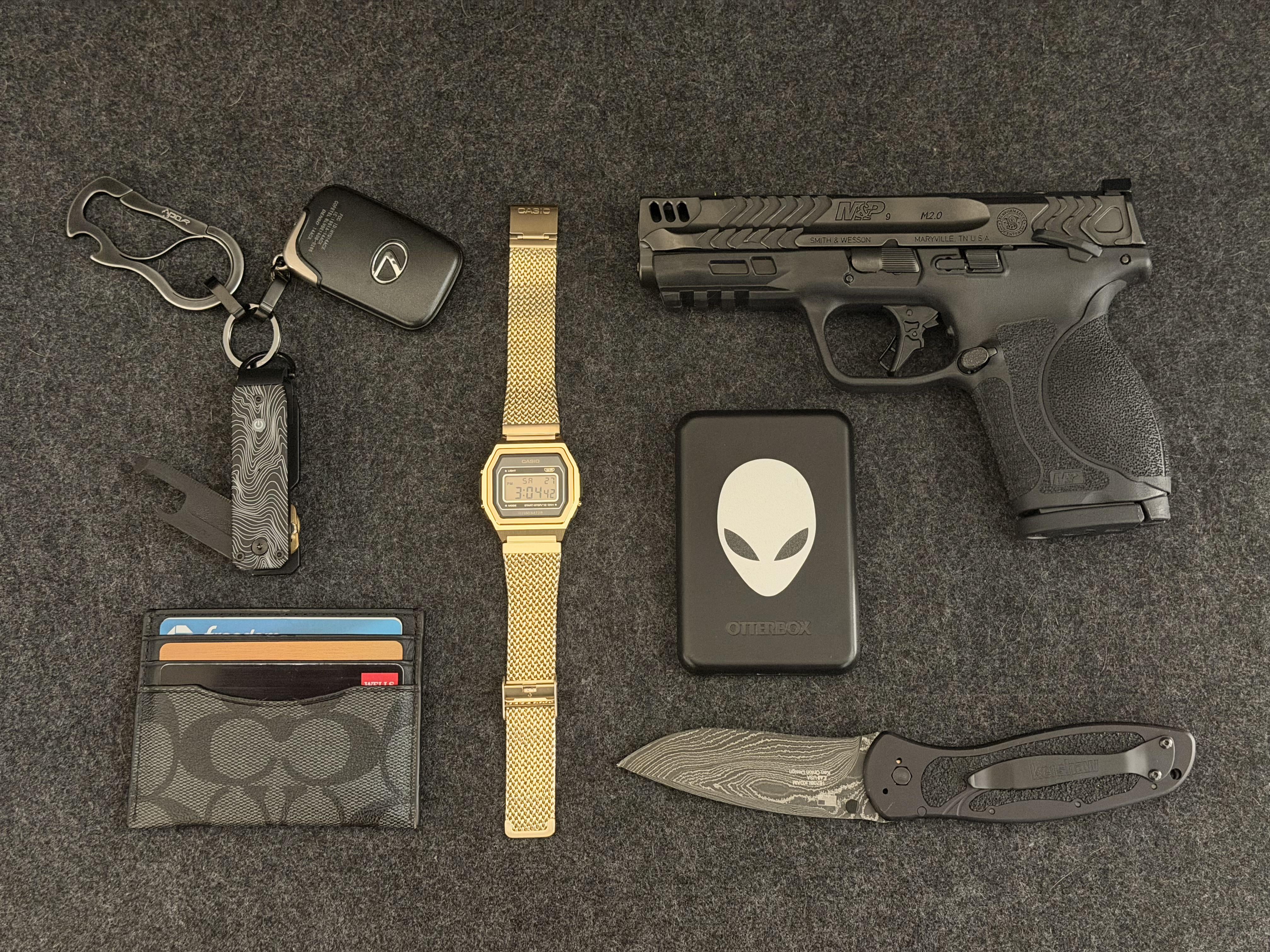 Carrying: •S&W – M&P Compact Carry Comp •Kershaw – Blur •Casio – A1000MGA-5 •Coach – Card Holder •Keys – Amazon Organizer and Orbitkey Multi-tool •Otterbox – Power Bank