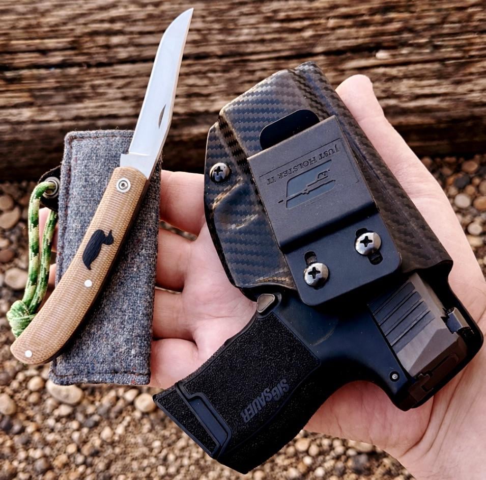 I possess the Sig Sauer P365 and a Tony Bose-inspired trapper crafted by David Dixon at Daddabreak Knives. Pray, what dost thou carry on this splendid Sunday?