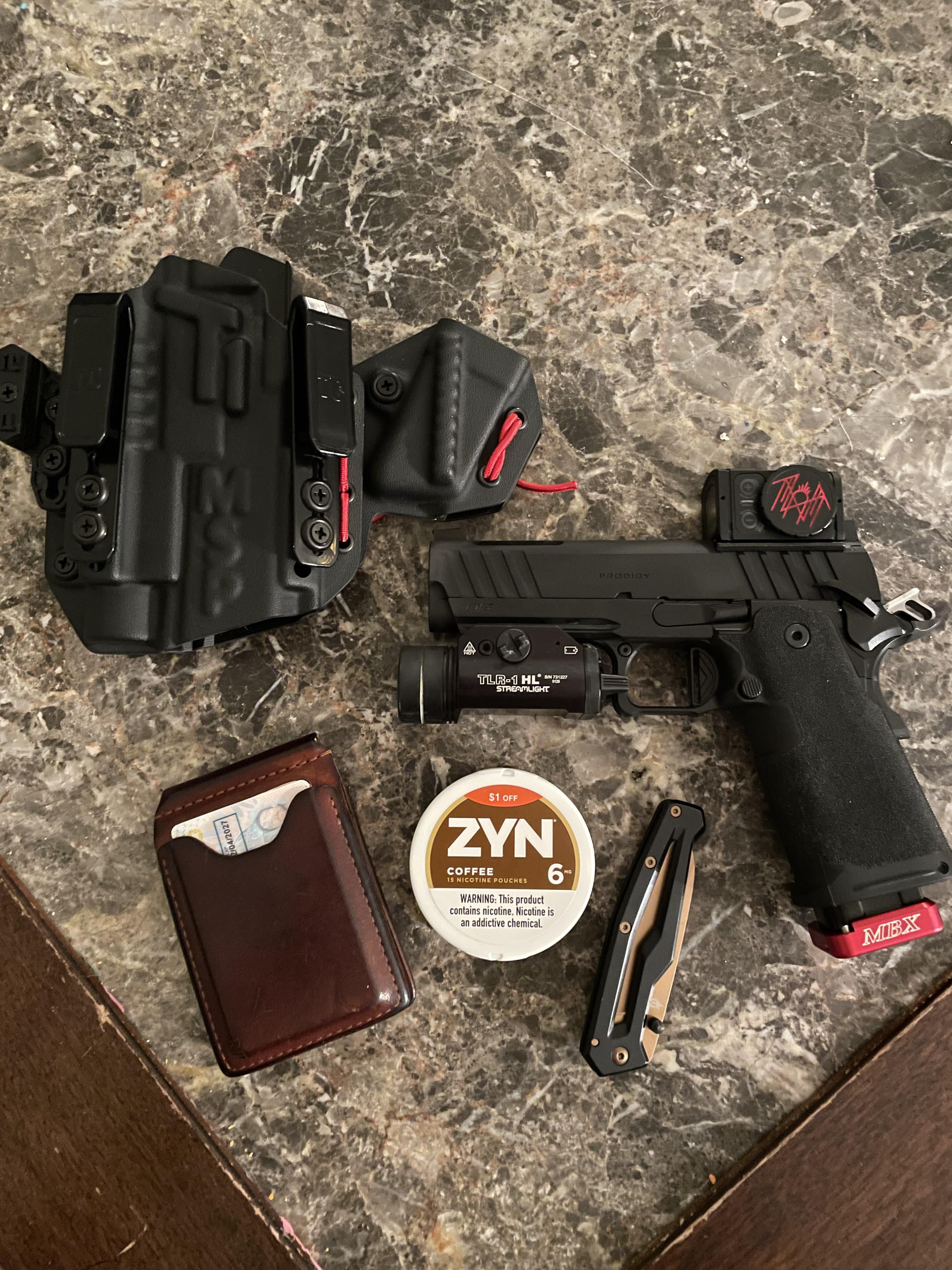 In EDC Daily non negotiables December 29, 2025 Tier 1 MSPHeavily upgraded Springfield Prodigy 4.25GERBER bladeZyn✌🏼Leather fold walletby Takemebacktoeatin EDC Prev Post Knife made from the steel of a T-34 battle tank December 29, 2025 Next Post PSA: Careful With Olive Wood Around Cats December 29, 2025 Related Posts Pocket Dump EDC / Whittle January 14, 2026 EDC Finally Dialed in January 14, 2026 Happy Wednesday all. . . Timex Expedition and Civivi Guile January 14, 2026 4 Comments AutoModerator 2 weeks ago Thank you for posting to r/EDC! Include a detailed item list (make/model) within **1 hour** of submission. Lists can go in the title, a comment, or the image. Posts without lists will be removed. If you have already provided a list, not further action is needed, thanks | [FAQ](https://www.reddit.com/r/EDC/wiki/faq)*I am a bot, and this action was performed automatically. Please [contact the moderators of this subreddit](/message/compose/?to=/r/EDC) if you have any questions or concerns.* boredguy1982 2 weeks ago Right on!https://preview.redd.it/q8bmgx7rt1ag1.jpeg?width=3595&format=pjpg&auto=webp&s=c59f8481ac4d58497e33cf20a0a40ac64cd06218 seemontyburns 2 weeks ago Can’t stop addicted to the zyn shit NekBodesh 2 weeks ago Sleep token logo on the optic???Write A CommentYou must be logged in to post a comment.