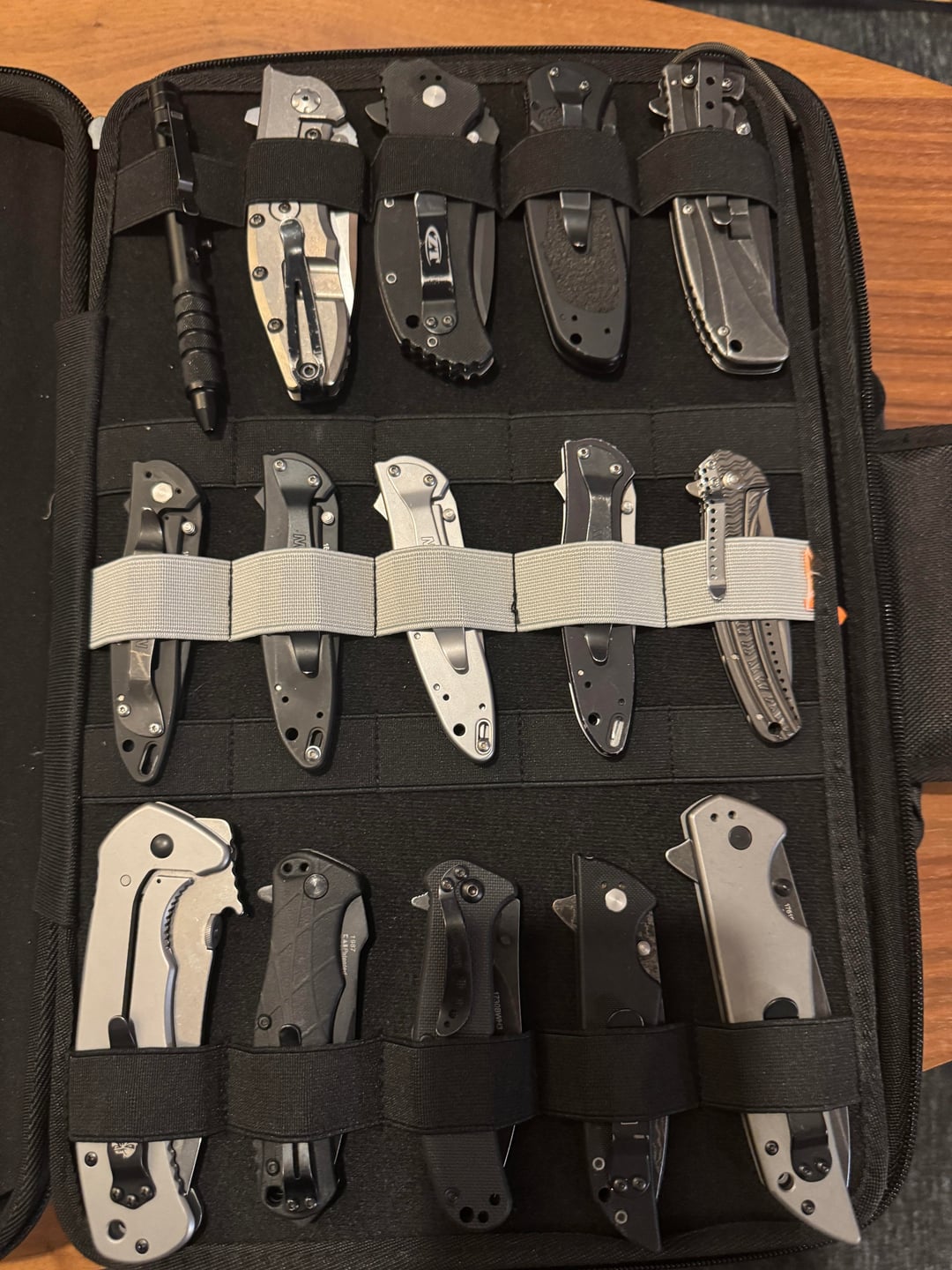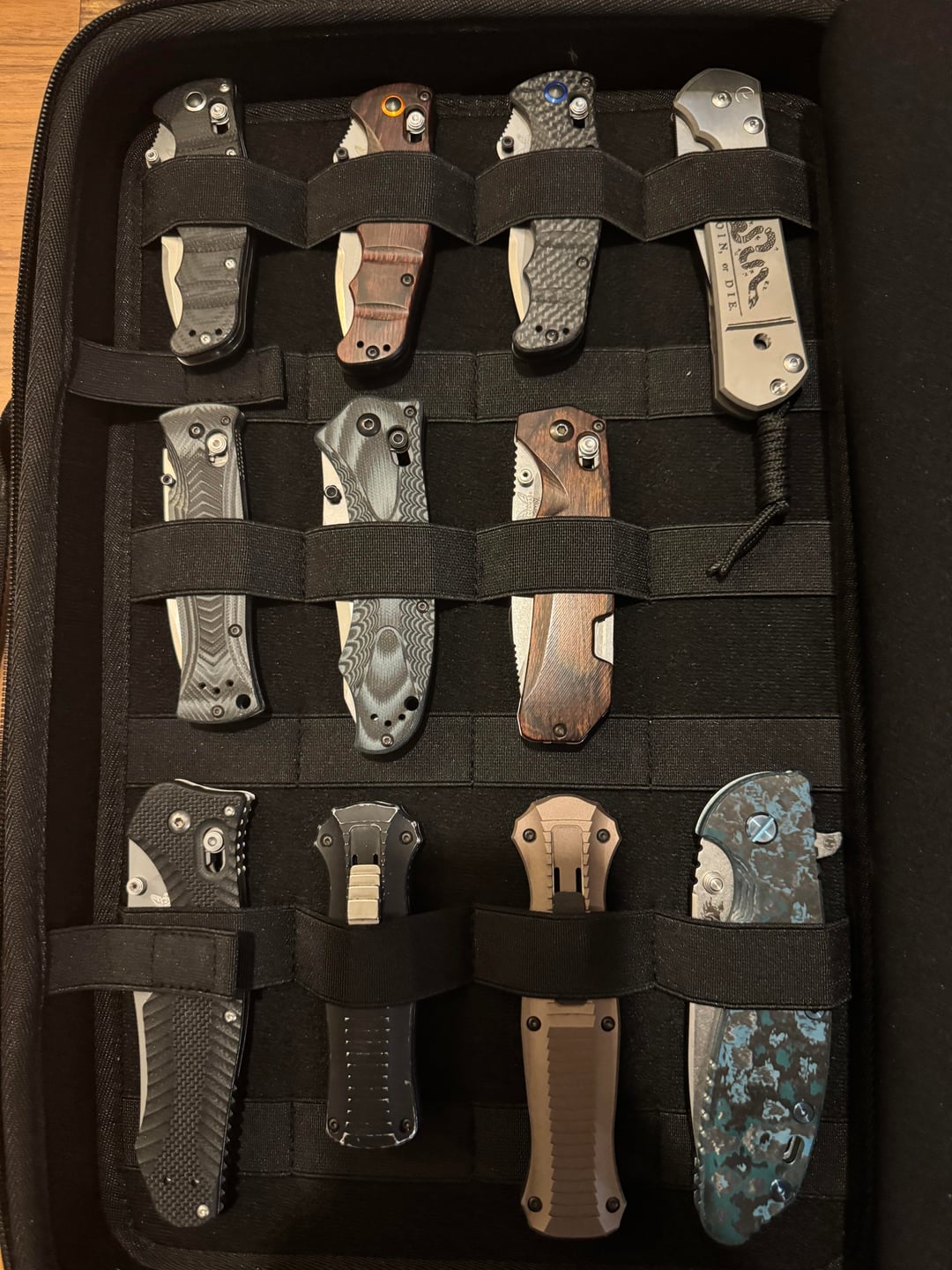 My fixed blades are my most collectable, so those that are not on display go into a zipped case, separate from its sheath, up to 20 in a large plastic tub.