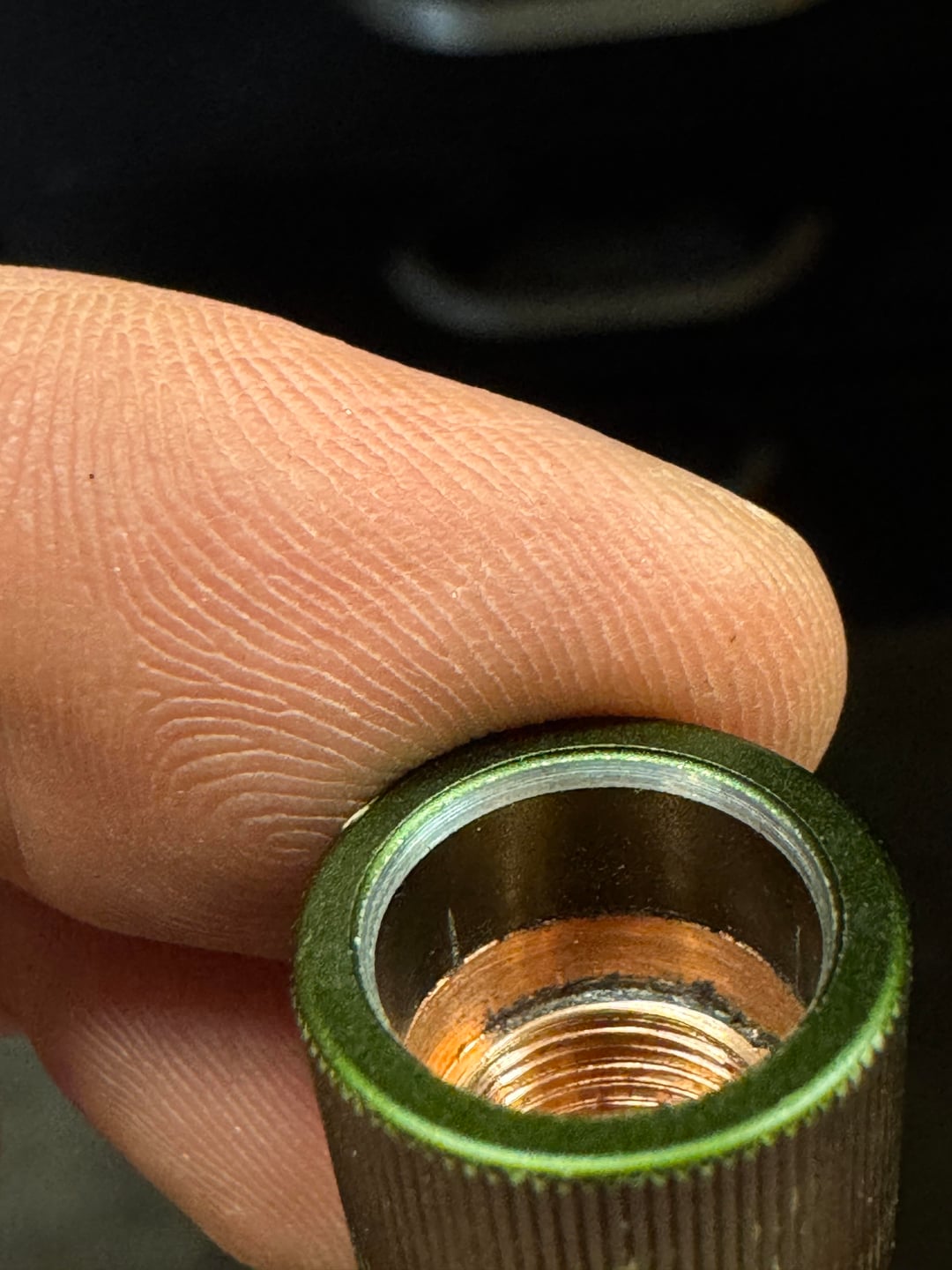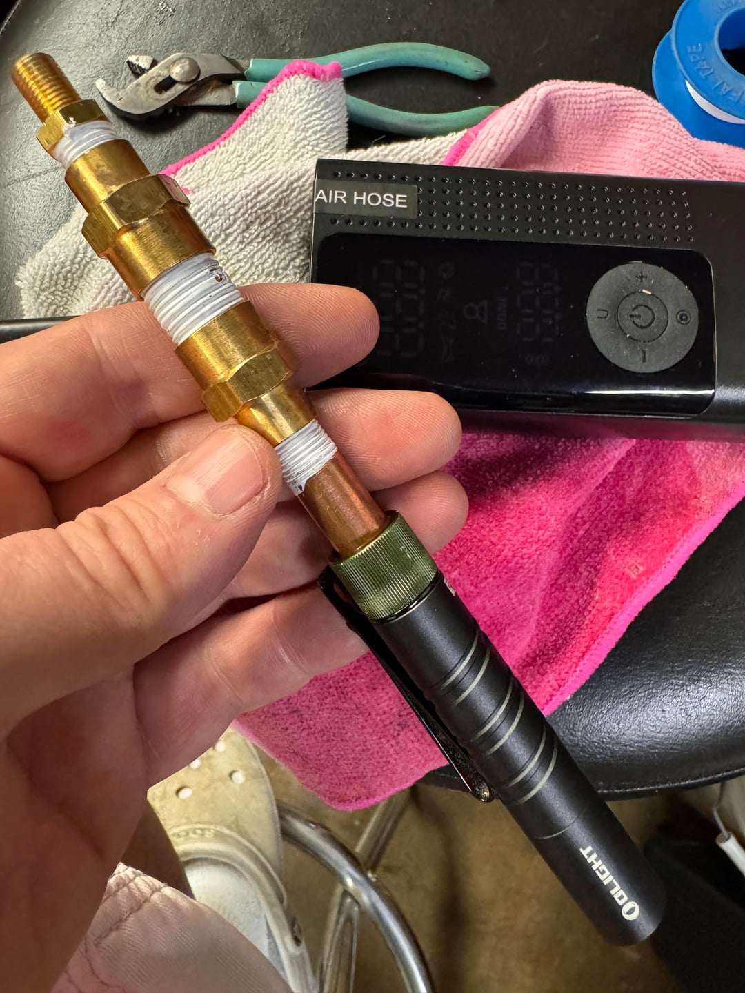 I heard of people using compressed air to push everything out of the front of the light but no one ever said how much is needed to do so. I tapped the tail switch so I could thread in a nipple and attach some fittings so I could use a car air pump but this little pump maxes out at 65psi. Well, nothing budged.