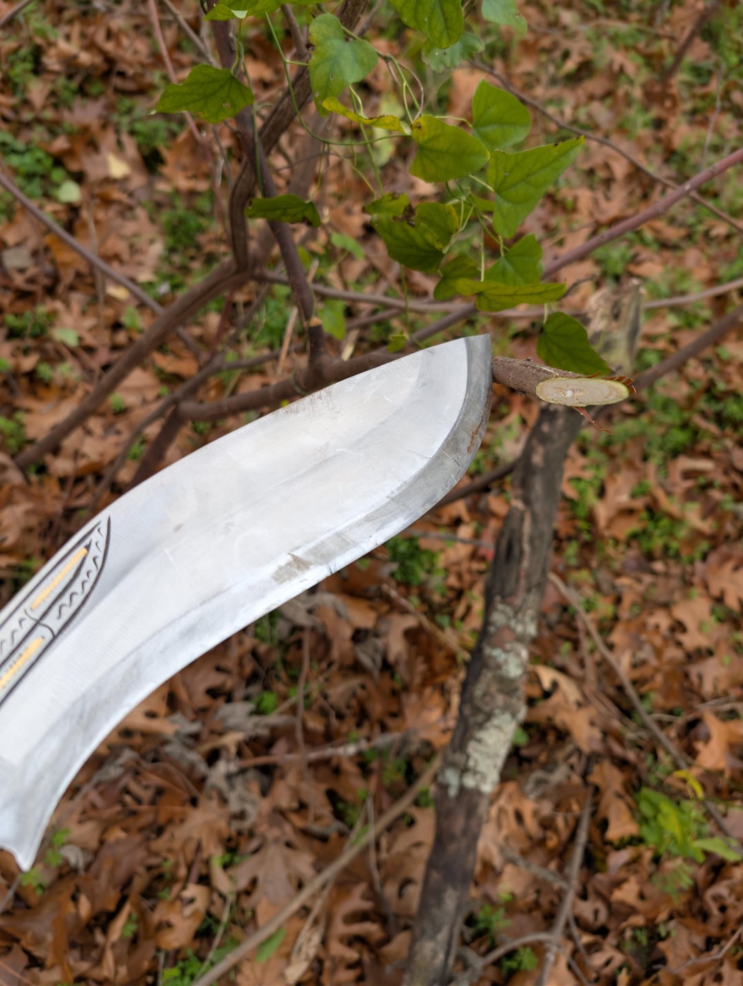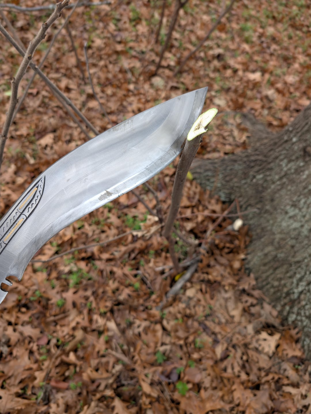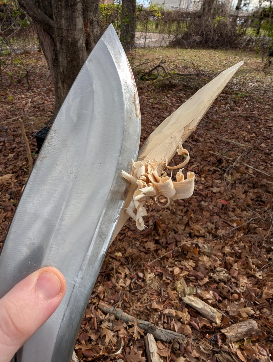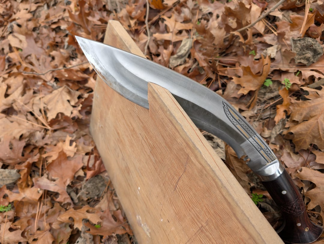 My first real kukri. Got it from Kult of Athena. It's made by Ex Gurkha Kukri House. 12" blade. Roughly 1/3" thick at the thickest part. 5160 steel. Honestly really happy with it! Obviously it's a real monster of a knife but I could still get some decent curls out of it. I'll do a more significant reprofile and sharpening eventually. To the surprise of literally no one it hits like a damn sledgehammer. None of the cuts in this were swinging for the fences. It was mostly just adding a bit of speed and direction to its natural fall. If this thing gets away from you it is going to be a very bad day. All in all I am very happy with it, especially for $100 it cost.