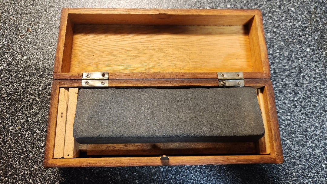 I want to be able to use this knife and keep it well maintained, how do I do that? Theres a little bit of brownish residue on the blade, I'm not sure if it's rust or just gunk. I'm not sure how I would go about cleaning it. It definitely needs some sharpening. Of his things I found what I think is a sharpening block. When I look at it it seems to have two levels of grit, one on each side, but I'm not sure if this block is worth using or if it's better to get a new one.