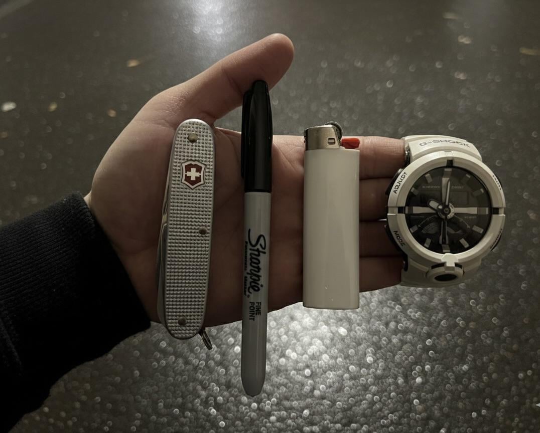 In EDC In my pockets on a night walk December 29, 2025 • Victorinox alox• sharpie• lighter bic• G-shock GA500Thoughts?💭by Ragno_4 EDC Prev Post Most recent pickups. Damn perfect every one December 29, 2025 Next Post is this hard for people like yall or nah December 29, 2025 Related Posts Pocket Dump EDC / Whittle January 14, 2026 EDC Finally Dialed in January 14, 2026 Happy Wednesday all. . . Timex Expedition and Civivi Guile January 14, 2026 4 Comments AutoModerator 2 weeks ago Thank you for posting to r/EDC! Include a detailed item list (make/model) within **1 hour** of submission. Lists can go in the title, a comment, or the image. Posts without lists will be removed. If you have already provided a list, not further action is needed, thanks | [FAQ](https://www.reddit.com/r/EDC/wiki/faq)*I am a bot, and this action was performed automatically. Please [contact the moderators of this subreddit](/message/compose/?to=/r/EDC) if you have any questions or concerns.* supperfash 2 weeks ago Why is watch in pocket? Antique_Eye_3200 2 weeks ago Which Alox model is it (I think maybe a Pioneer)? G_aiejoe 2 weeks ago You’re a straight man.Write A CommentYou must be logged in to post a comment.