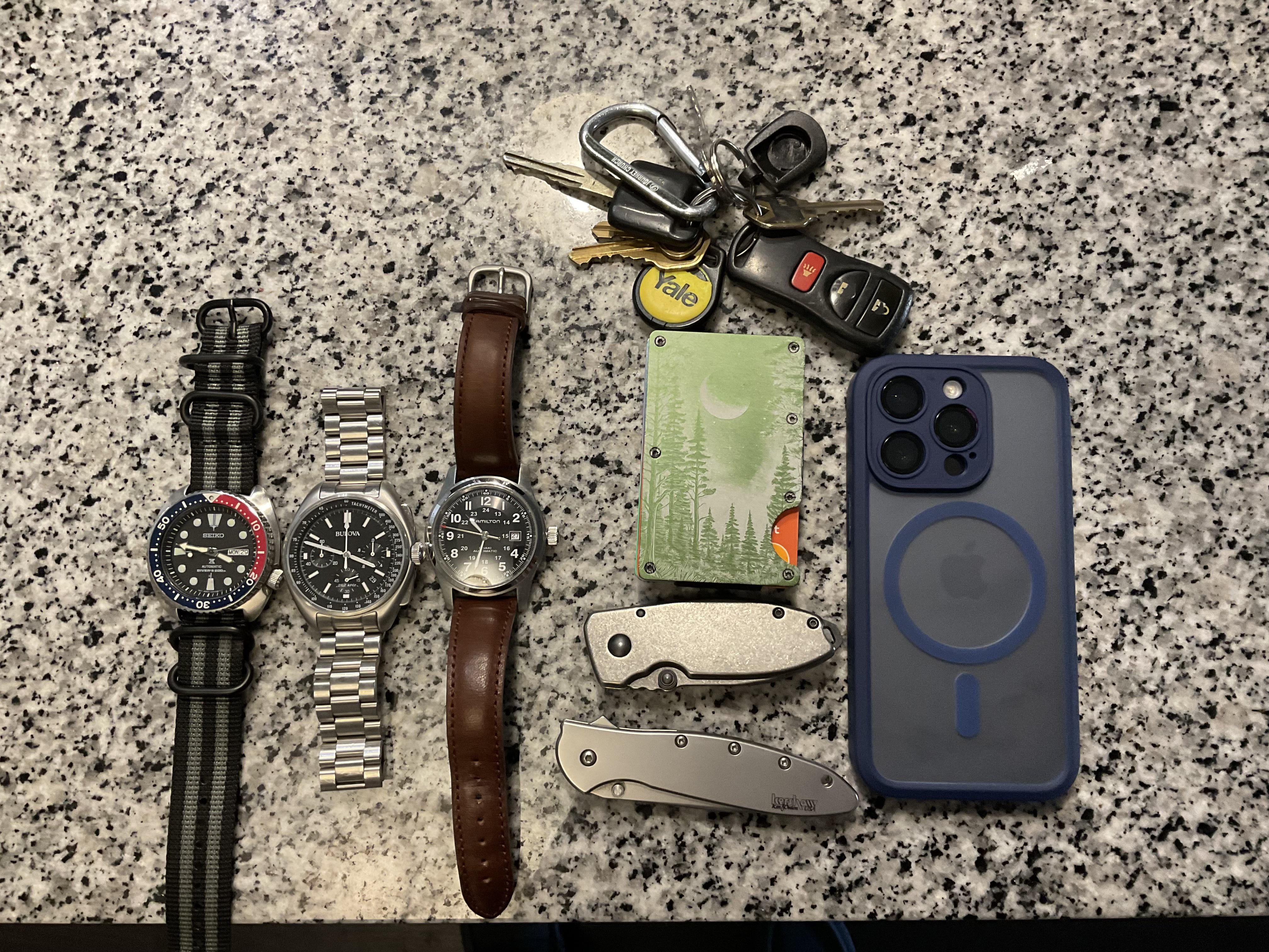 Seiko Turtle, Bulova Lunar Pilot 45mm, Hamilton Khaki Field 42mm, CRKT Squid, Kershaw Leek, IPhone 15 Pro, Truck Keys, and Ridge Wallet knock off with custom engraving.