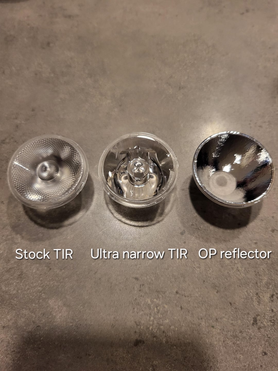 Here's a little comparison of all three beam patterns. Pictures are taken with my cellphone, so they aren't perfect. I had to change the colors in the app to fit better the reality, but it's still not perfect. Also, the super narrow TIR has a small dark dot right in the center, which is a bit annoying.