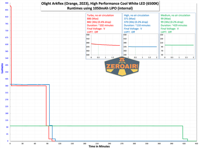 - The ArkFlex usable medium lasts much longer (7 hours at 95 lumens vs. 3 hours at 120 warm /150 cool lumens for the Nitecore) as does low mode (38 hours at 15 lumens vs. 13 hours at 30 warm/50 cool lumens for the Nitecore).