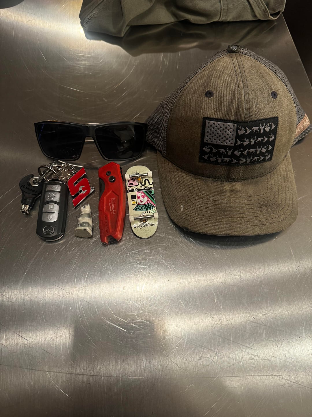 My fastback, my fingerboard, my keys, and some type of trinket