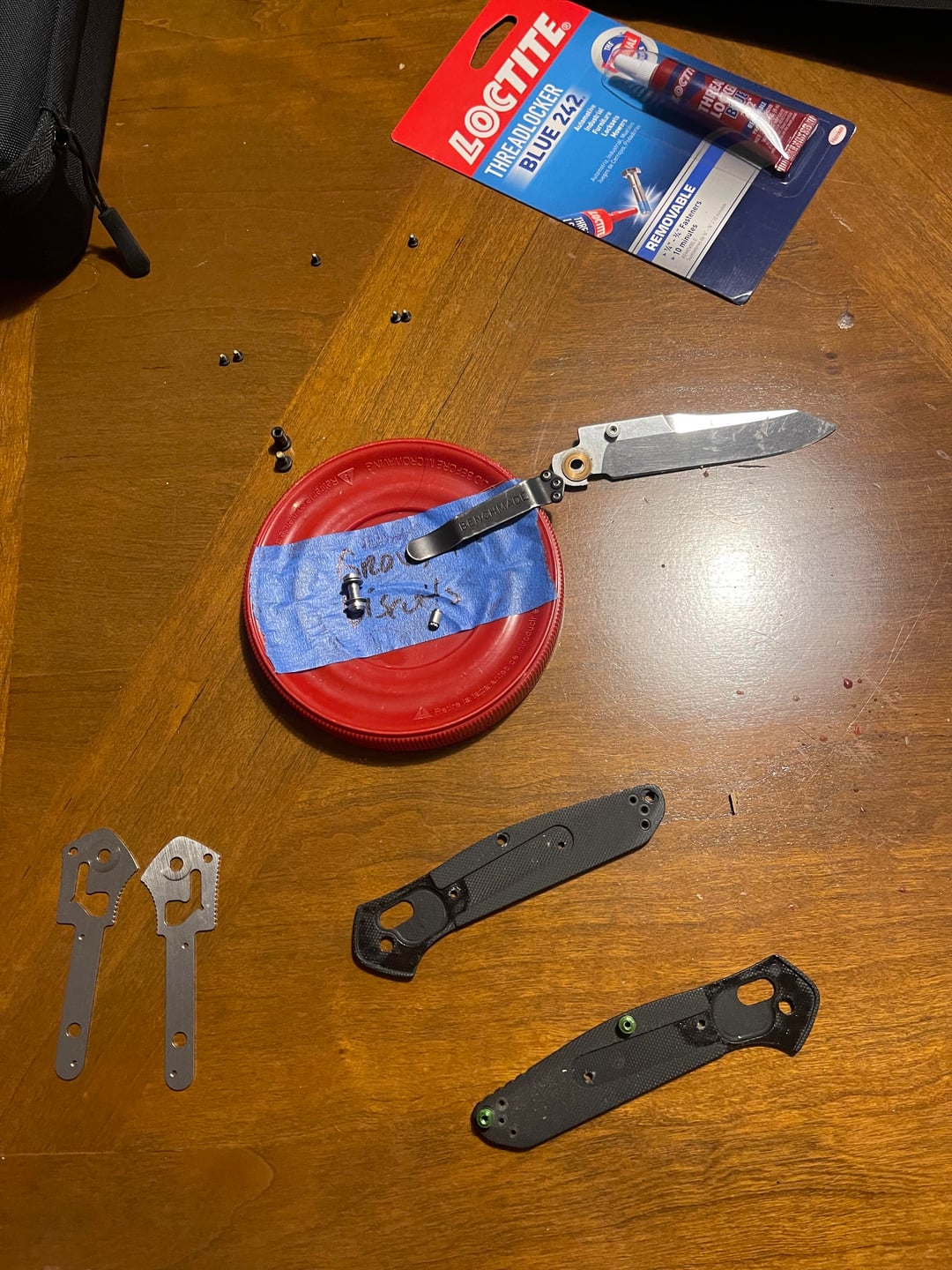 I use the same red Tupperware lids to hold my knife parts when I take them apart 😂