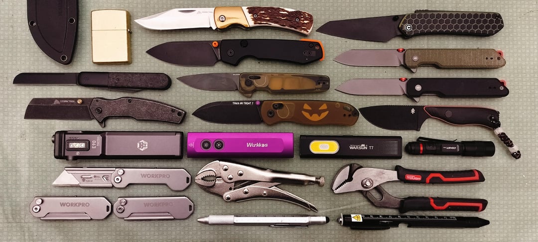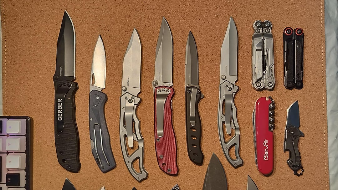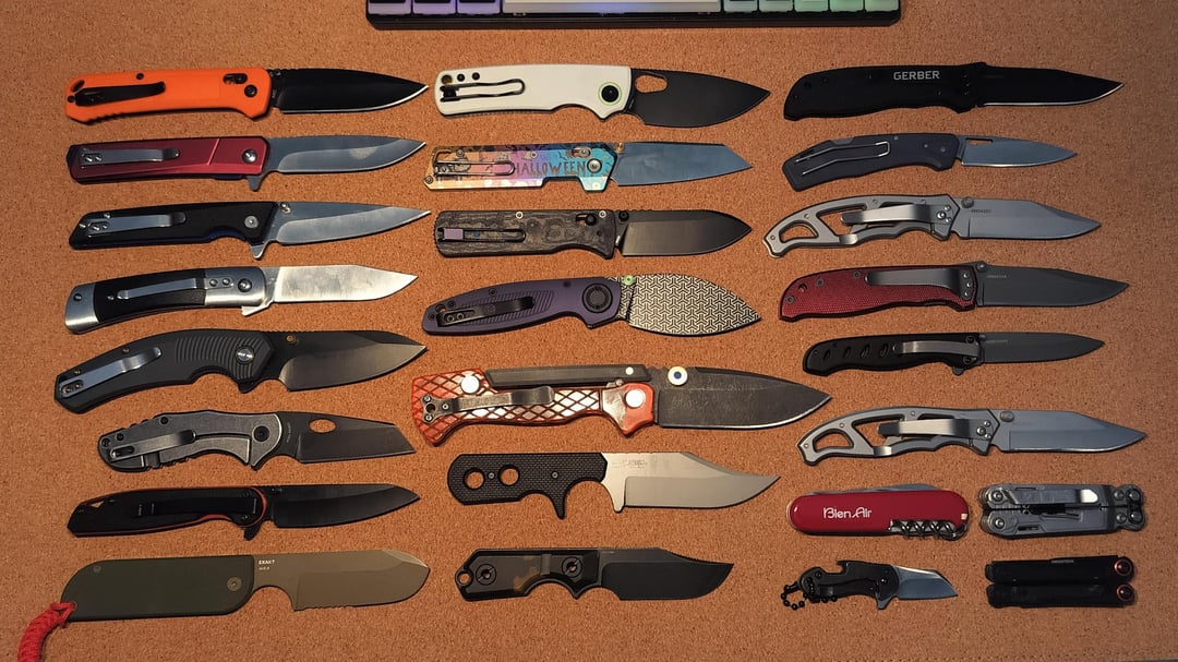4: Gerber 2025 Greatest Hits Pack x2 (Air Ranger G10, LST, Paraframe w/bronze washers), Gerb 2024 GHP (Air Ranger aluminum, Evo Jr., Paraframe w/teflon washers), Sog Powerpint, ST Uberall, SAK not sure the model, S&W Drive. There is also an SAK SD in blue that matches the full size one that I gave away to a family member.