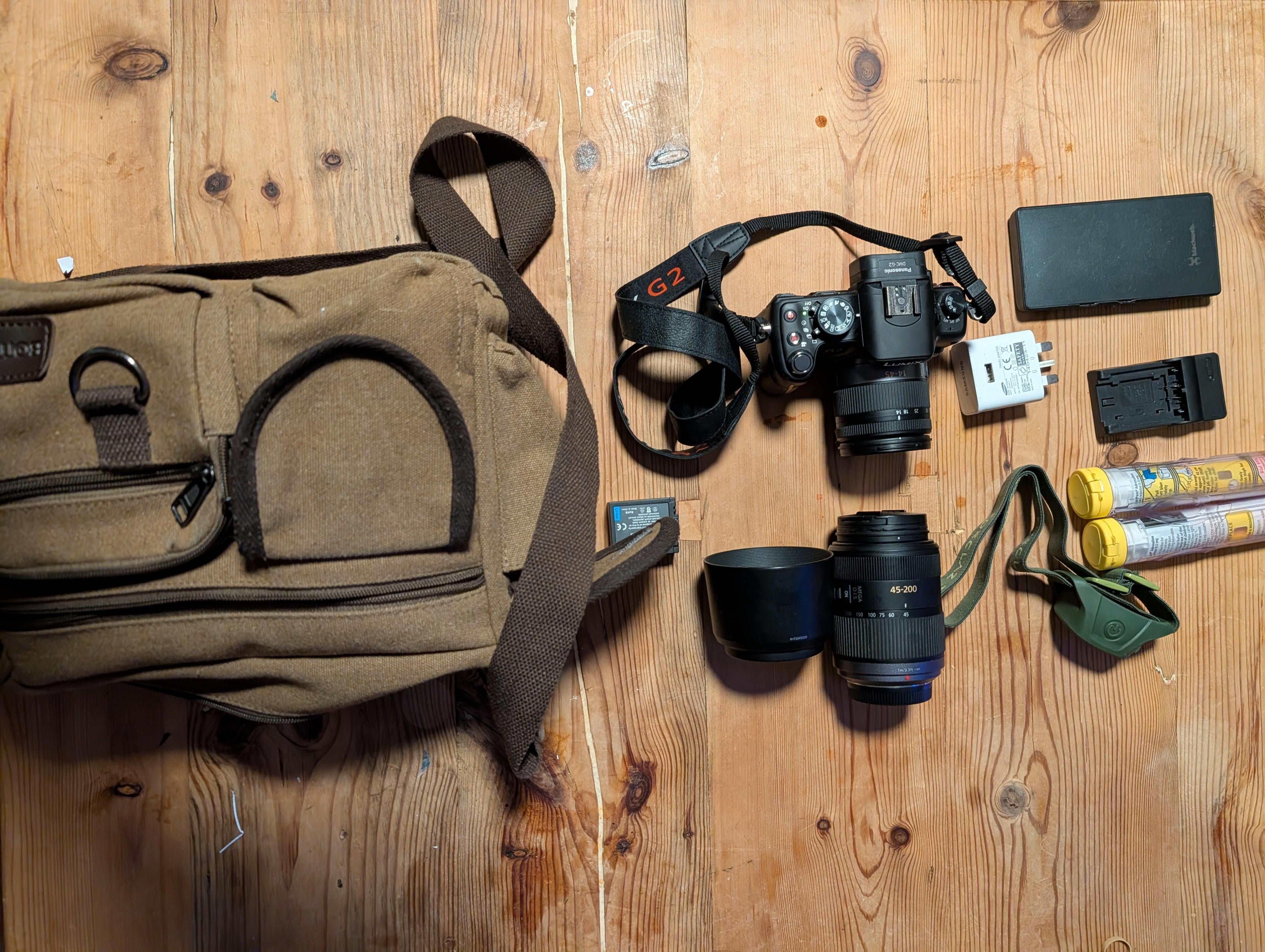 howtokrew 2 weeks ago Lumix G214-45 3.5-5.645-200 4.5.6Head torchBatteries for cameraBattery bankCamera chargerEpi pensRandom inconspicuous bag with lowepro insert