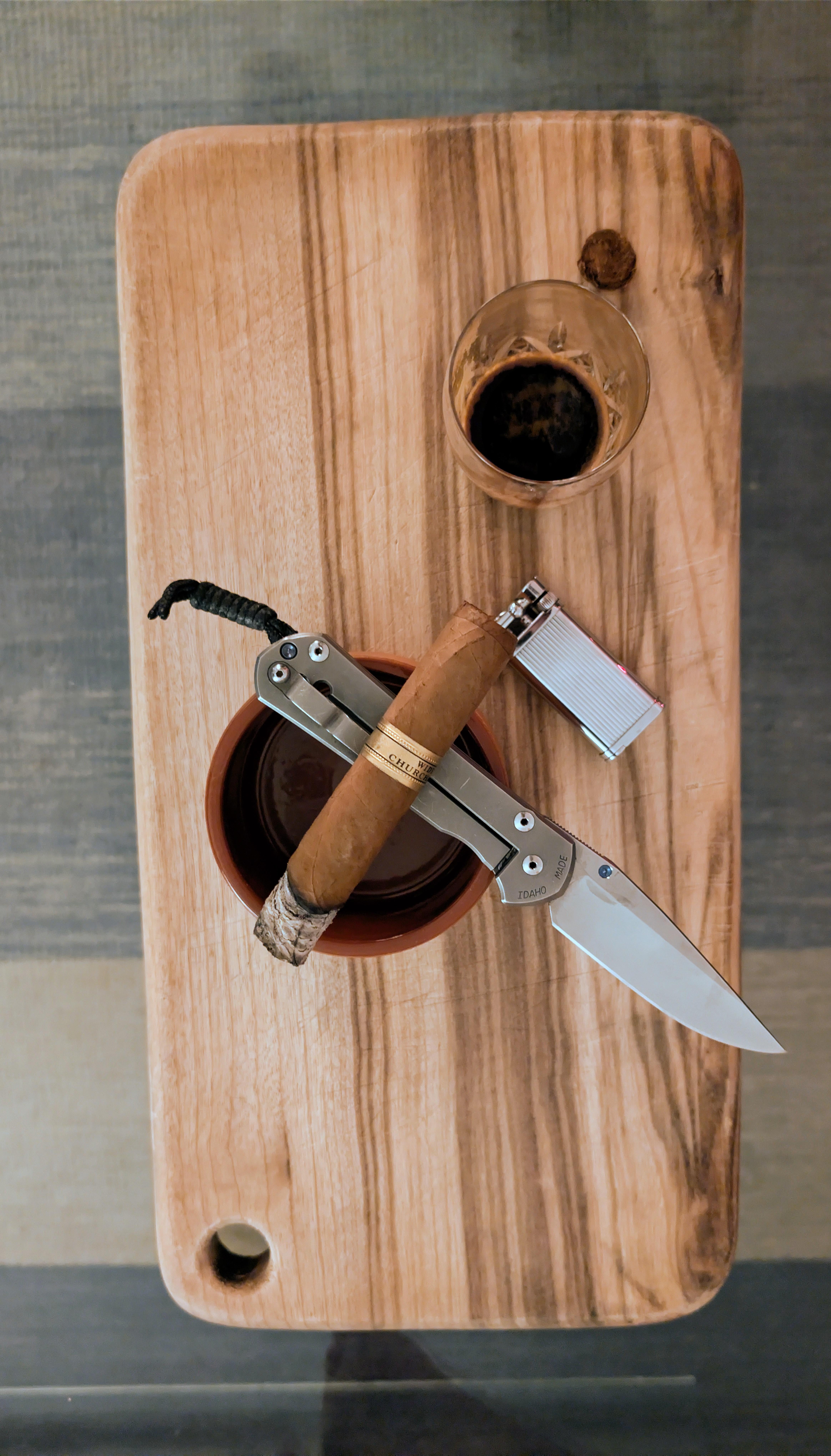 CRK Large Sebenza 21. I've had this since 2012, and just put a fresh 17dps edge on it. It sliced the cap of this cigar nice and clean. Happy New Year πŸ™‚