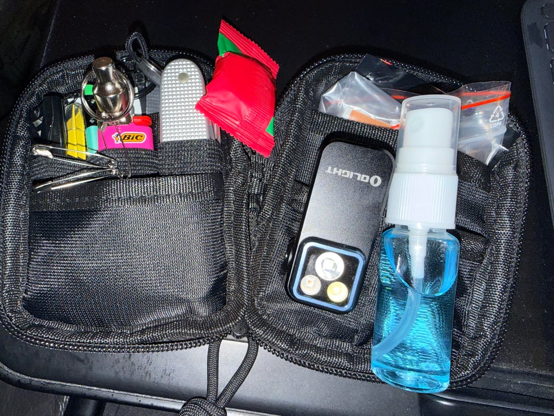 Inside on the right: Tweezers, Olight Oclip flashlight, small magnet, 20 ml spray bottle of skin disinfectant