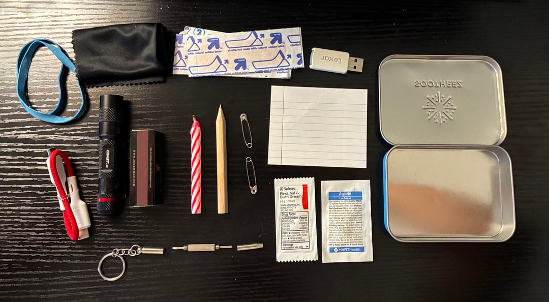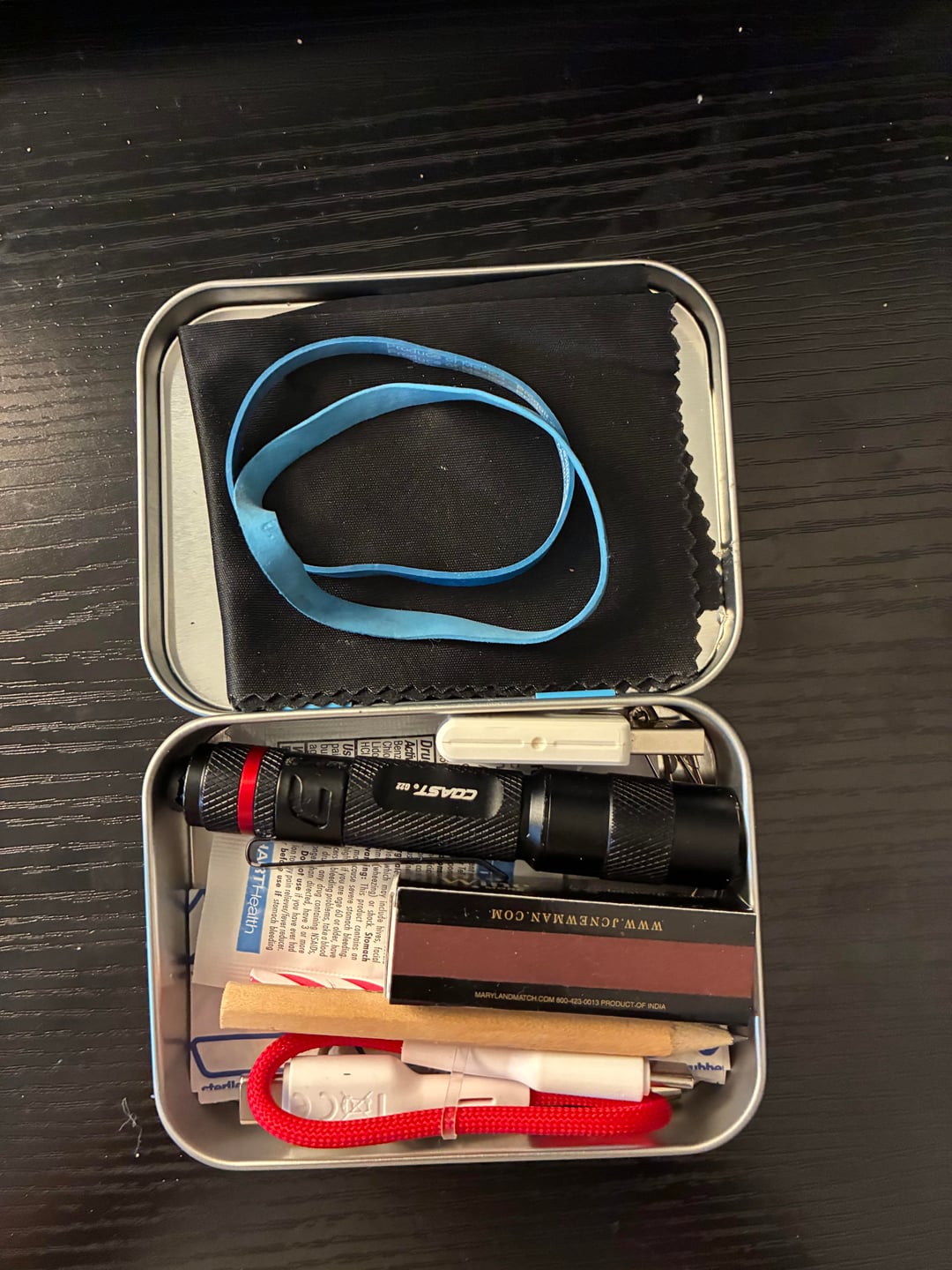 First time doing an EDC Tin. I will eventually convert this to a pouch. Sticker courtesy of my daughter. What does everyone think?