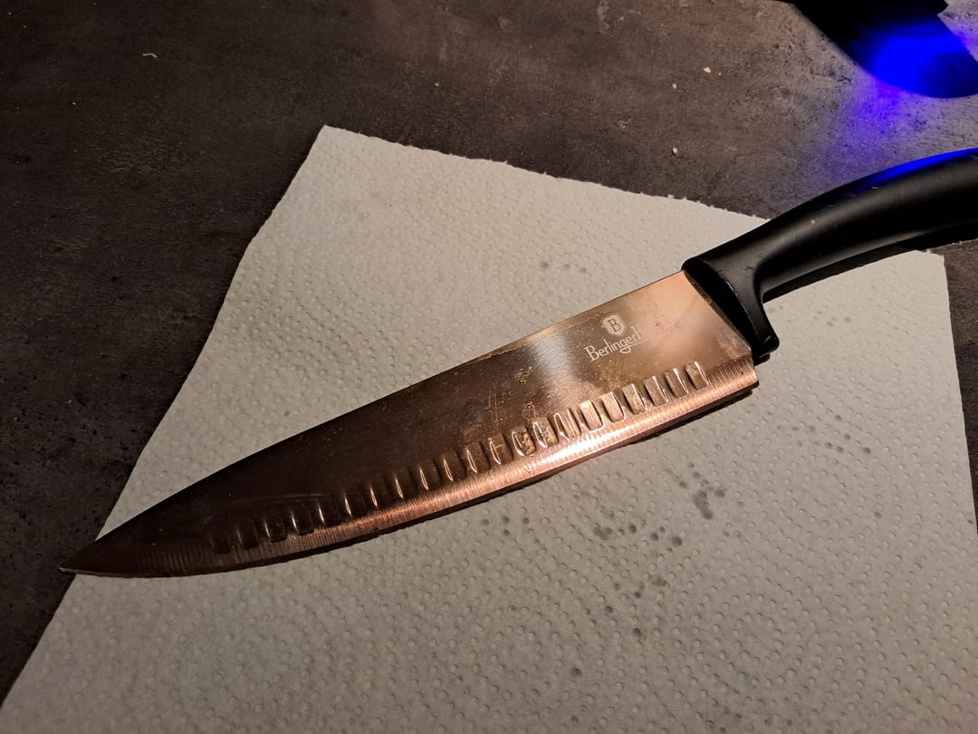 Hi, the last tennant of our appartment left this chefs knife behind. But it has a very orange-y color. Does this mean anything? Or do I just sharpen it up and accept this as a (forgotten) gift? Or did they intentionally leave it behind because something is wrong with it?