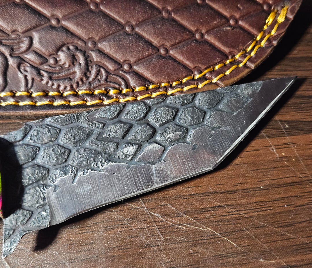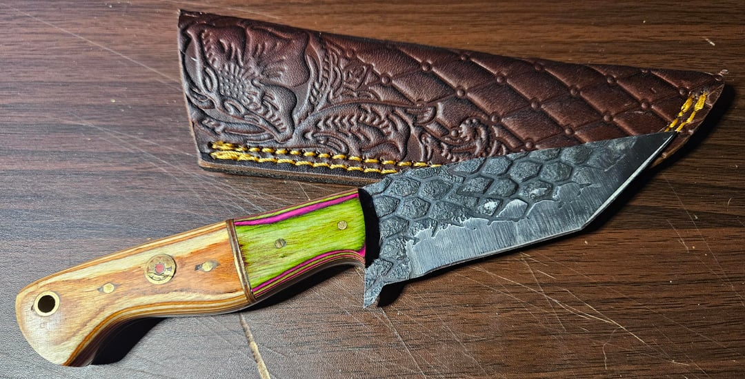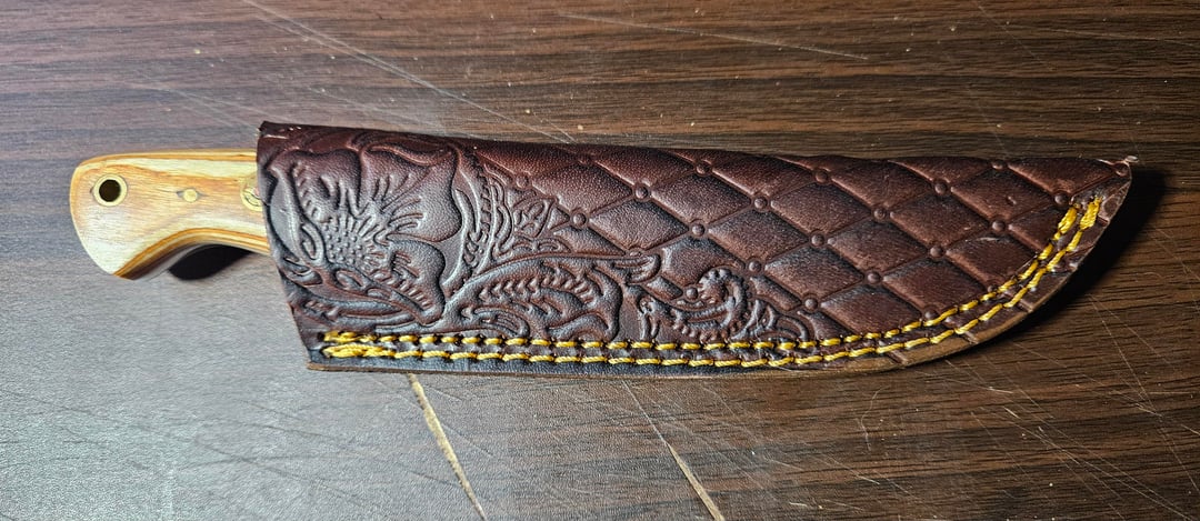 I won this in a raffle for a dog rescue I foster for. The sheath is made from super thick, hand-tooled leather & smells amazing. The knife is made from a file, or rasp. I wish there were more markings, but there's nothing to indicate who made it.