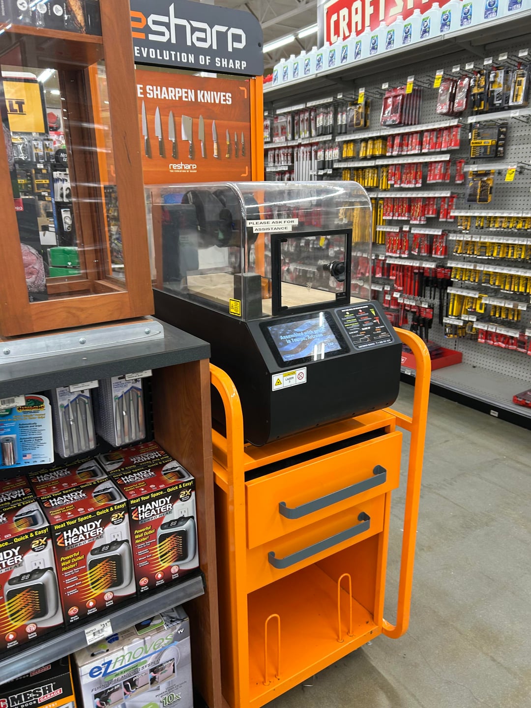 I used to manage a ace hardware that had a resharp it worked ok great for kitchen knives or knives that you don’t care about. Even used it on my griptillan it worked ok on it great for softer steels not so great for the harder stuff