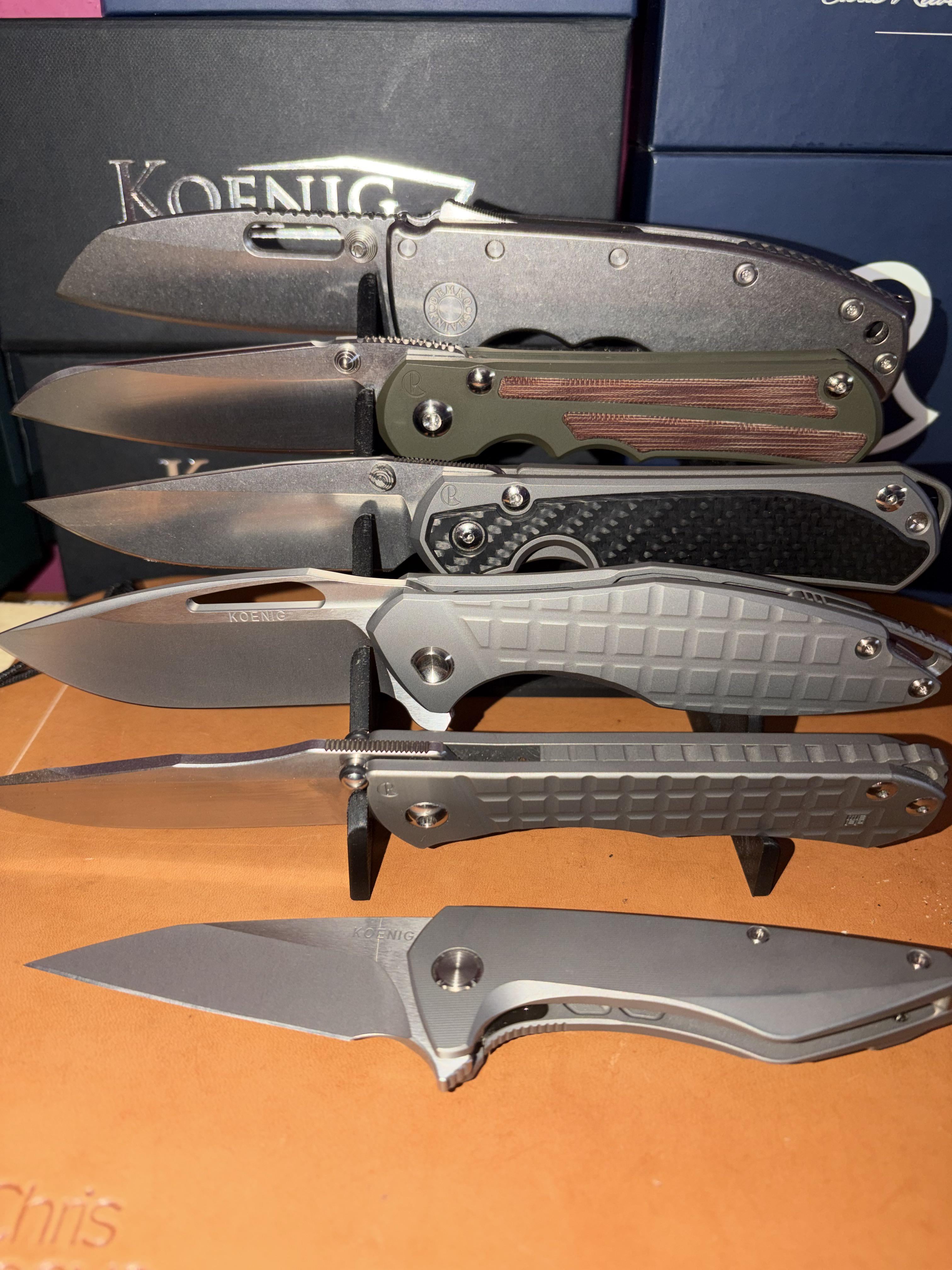 Demko AD20, CRK Inkosi (OD green w/micarta),CRK Sebenza w/carbon fiber inlays,MEFP Koenig Arius,MEFP CRK Umnumzaan, Koenig Mini Goblin