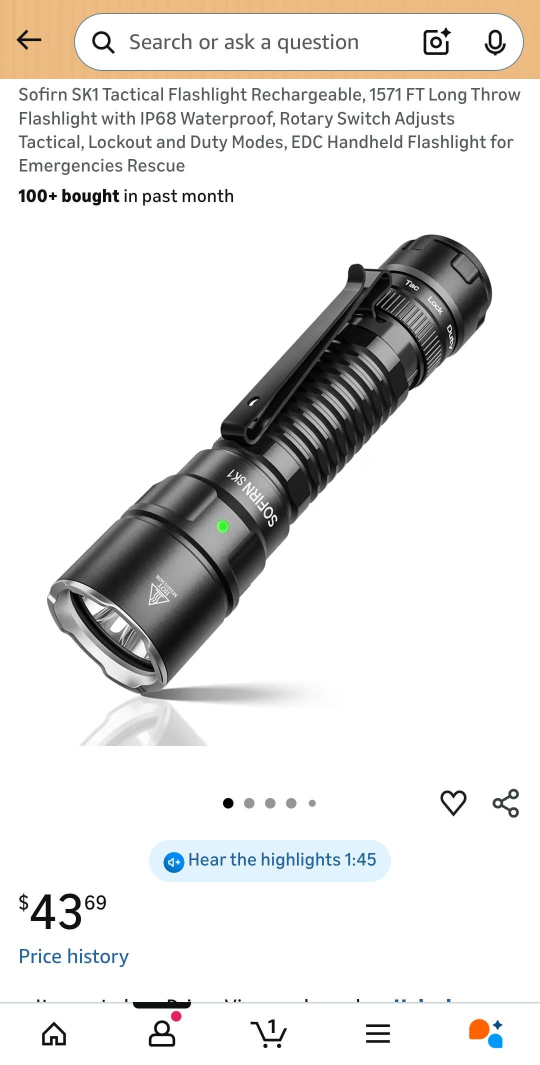 Just as a note, I want this for night time exploring in the woods. I go out and feed wildlife and like to be able to point the light directly at the intended target briefly for identification and do not want a lot of spillage. I currently am using some cheap flashlights that I got off of Amazon. They get the job done but they have definitely helped me determine what I DON'T want in my first expensive and serious flashlight purchase. Just to tell you more of where I'm coming from, the best of the cheap flashlights I use right now is one called Sofirn SK1 and tbh it's actually not terrible for what I use it for. The problem is that it will randomly turn off when it is nowhere near dead yet, the battery life is abysmal at best, and in the first few months of having it the power button basically just stopped working as intended for no reason (meaning I have to confess all of my sins, buy it a drink, throw salt over my shoulder, and hire an exorcist just to get it to turn on sometimes). I am including a picture of the cheap flashlight from Amazon for context. And it was much cheaper than $43 when I bought it.