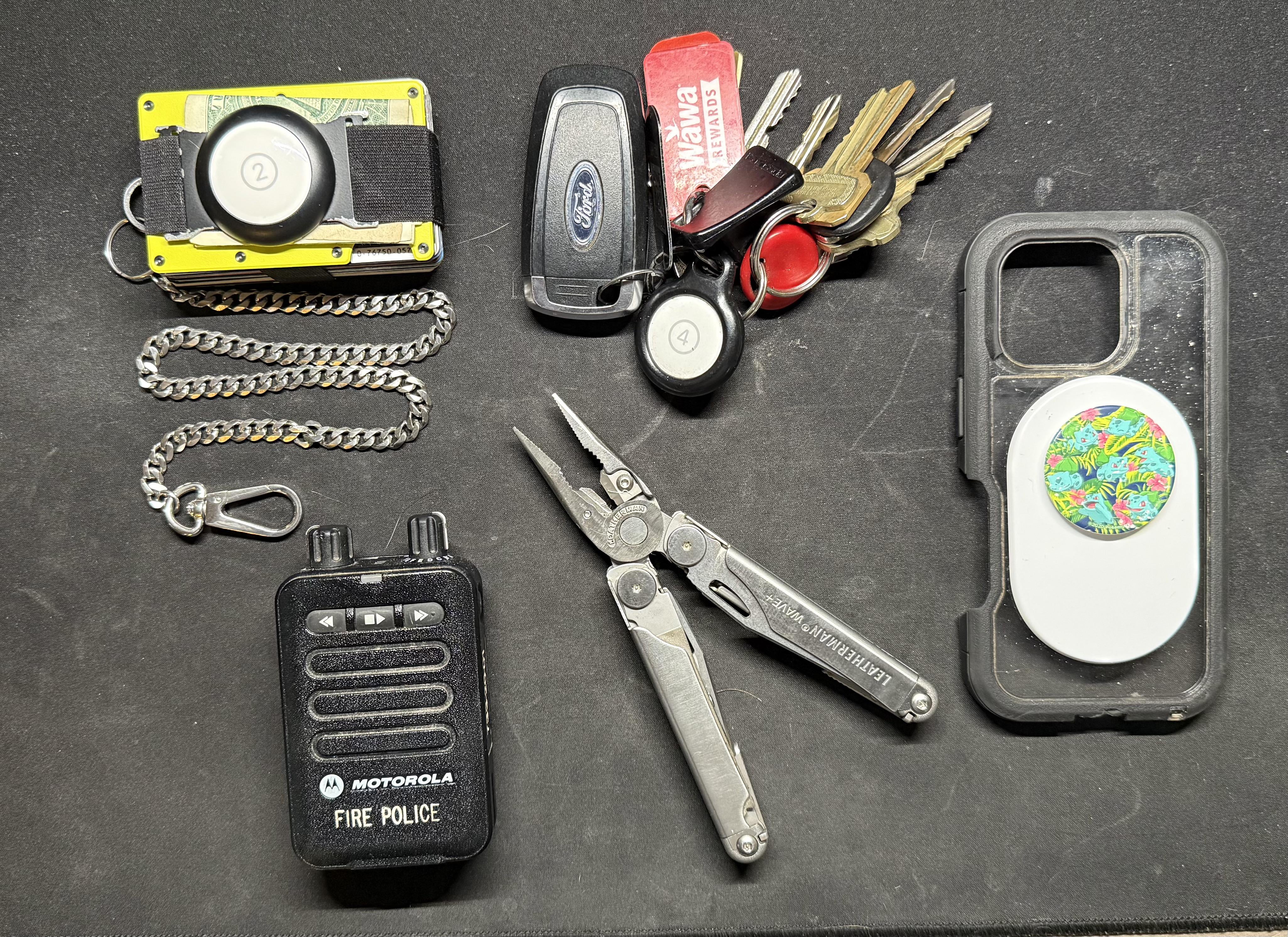 -Ford F350 keys, a bunch of keys for house, FD, and family houses, plus an airtag