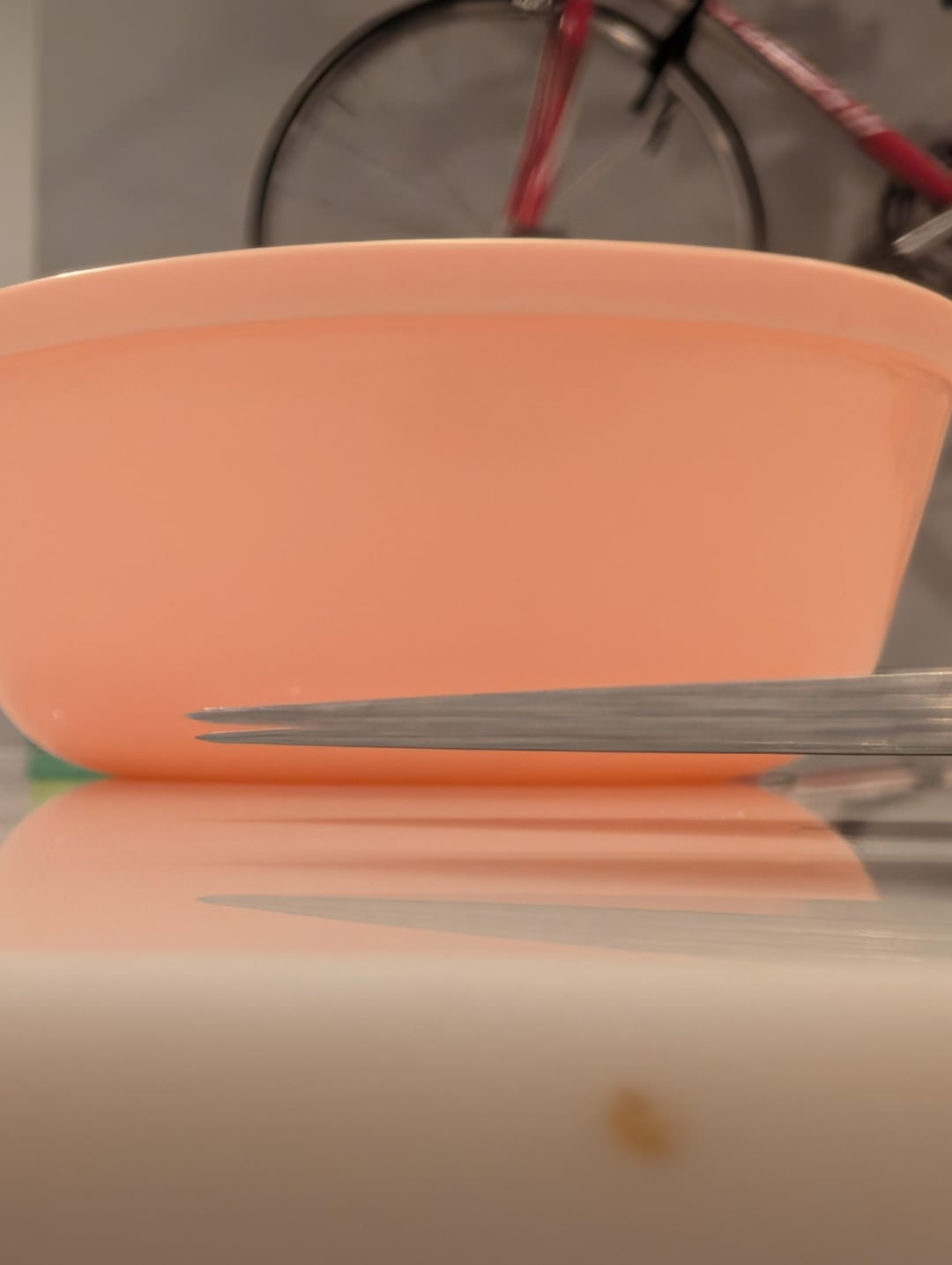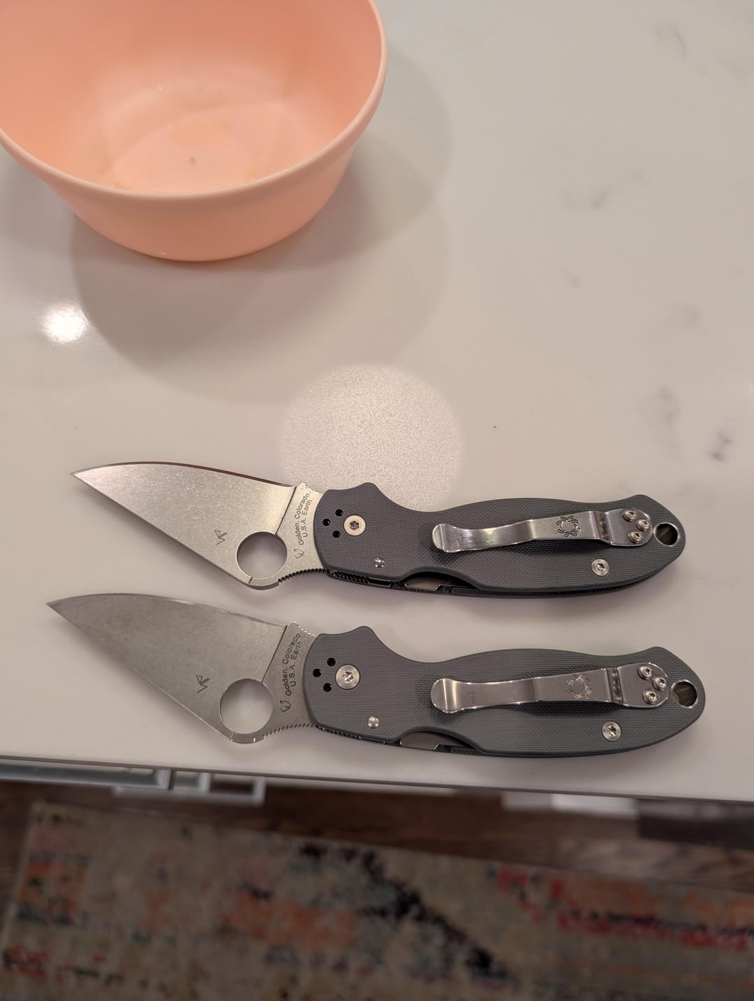I found the difference when I placed both knives down on their flat side (photo 1) and attempted to line them up with one eye closed so that the blade in the background was completely covered by the blade in the foreground. In doing so, I recognized that the factory seconds blade tilts slightly upward (photo 2). I can't tell where in the blade the warping begins (could be the pivot). But yea, it's very slight and when I put them spine to spine, I don't see the warp because the spines align perfectly, so my guess is the warp is at the pivot area.