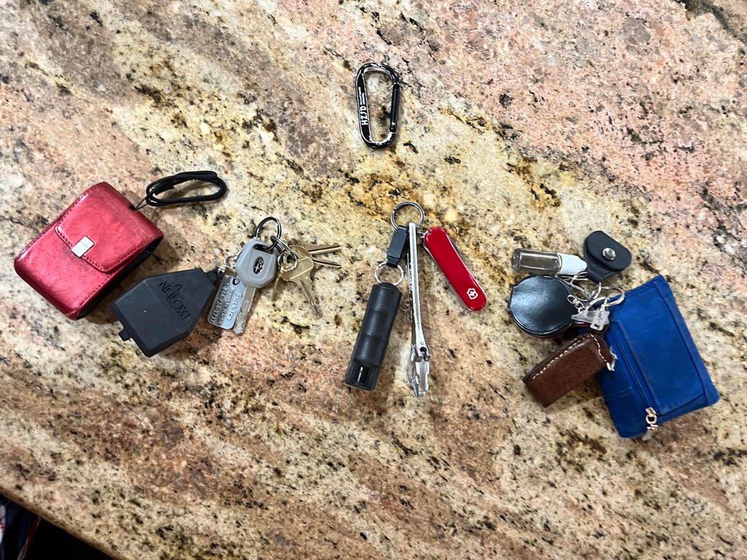 From left to right: camera, narcan, whistle, car keys, drawer keys, house keys, room keys, mail keys, pepper spray, wrench, Swiss Army knife, hydrocloric acid (geology major), magnifying glass (also geology major), lighter holder, wallet, and guitar pick holder.