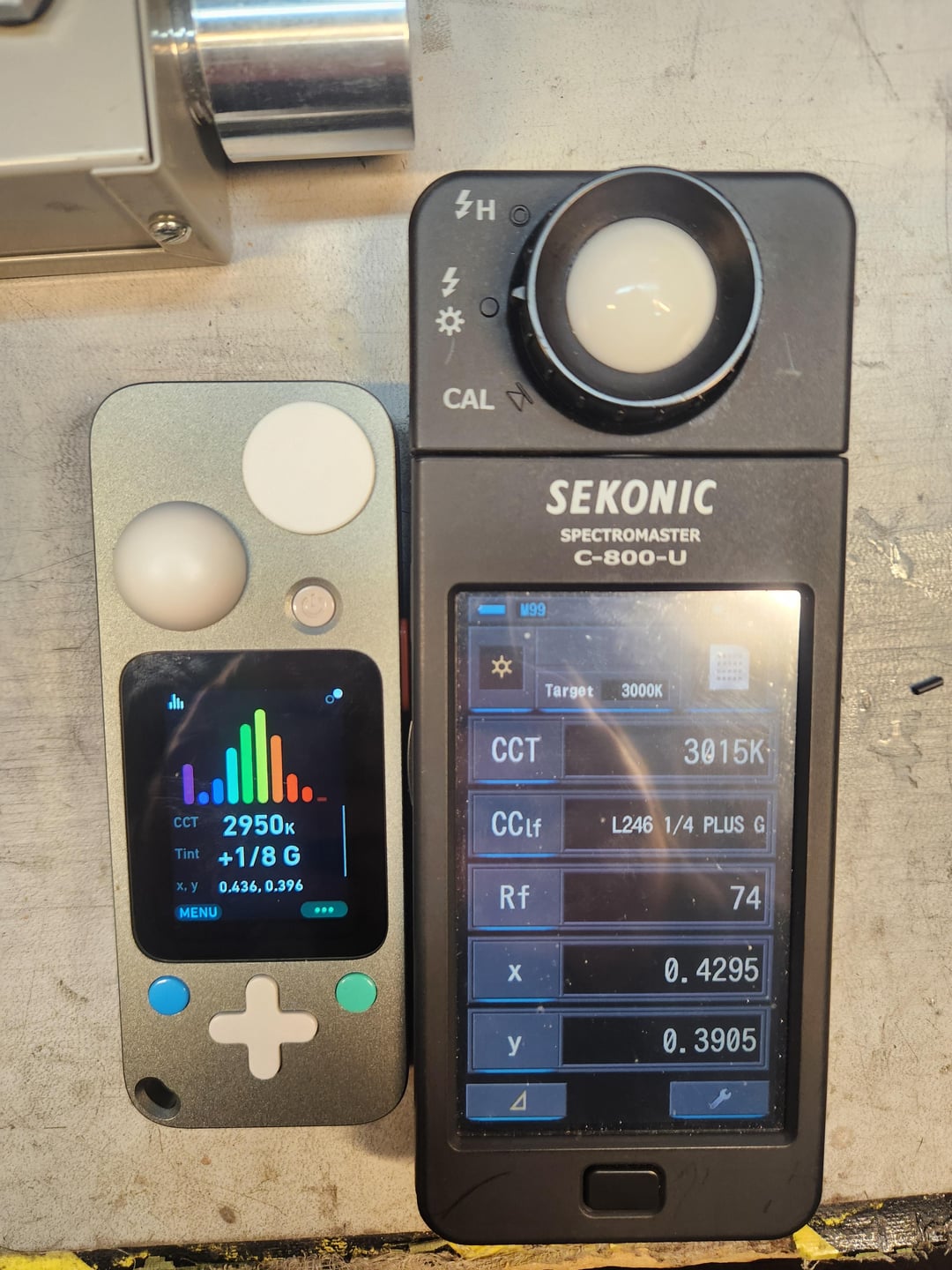 Using the Sekonic C800 and the Lit Duo 1 you can see the color temp is pretty close to the 3000K. It is a bit magenta but not horrible but the CRI is pretty low at 74.