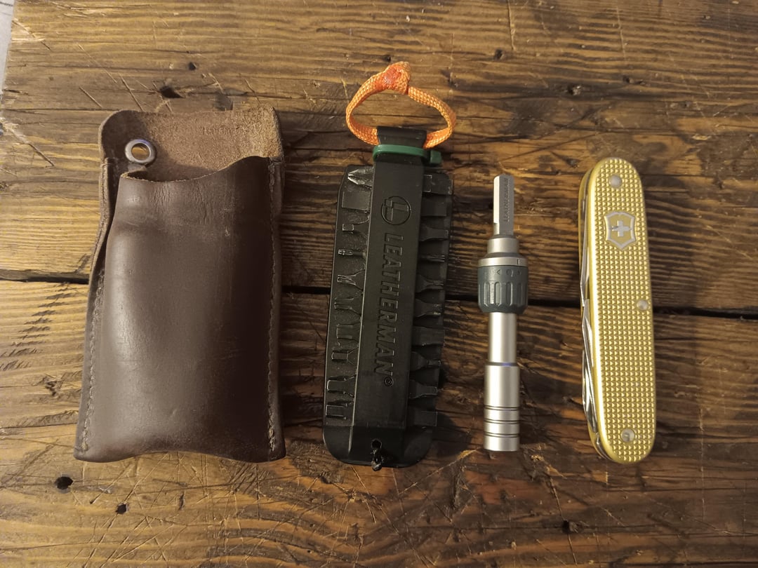 Last is the hide and drink leather pouch with a leatherman bit kit and ratchet extension and the new alox slim companion without the blade.