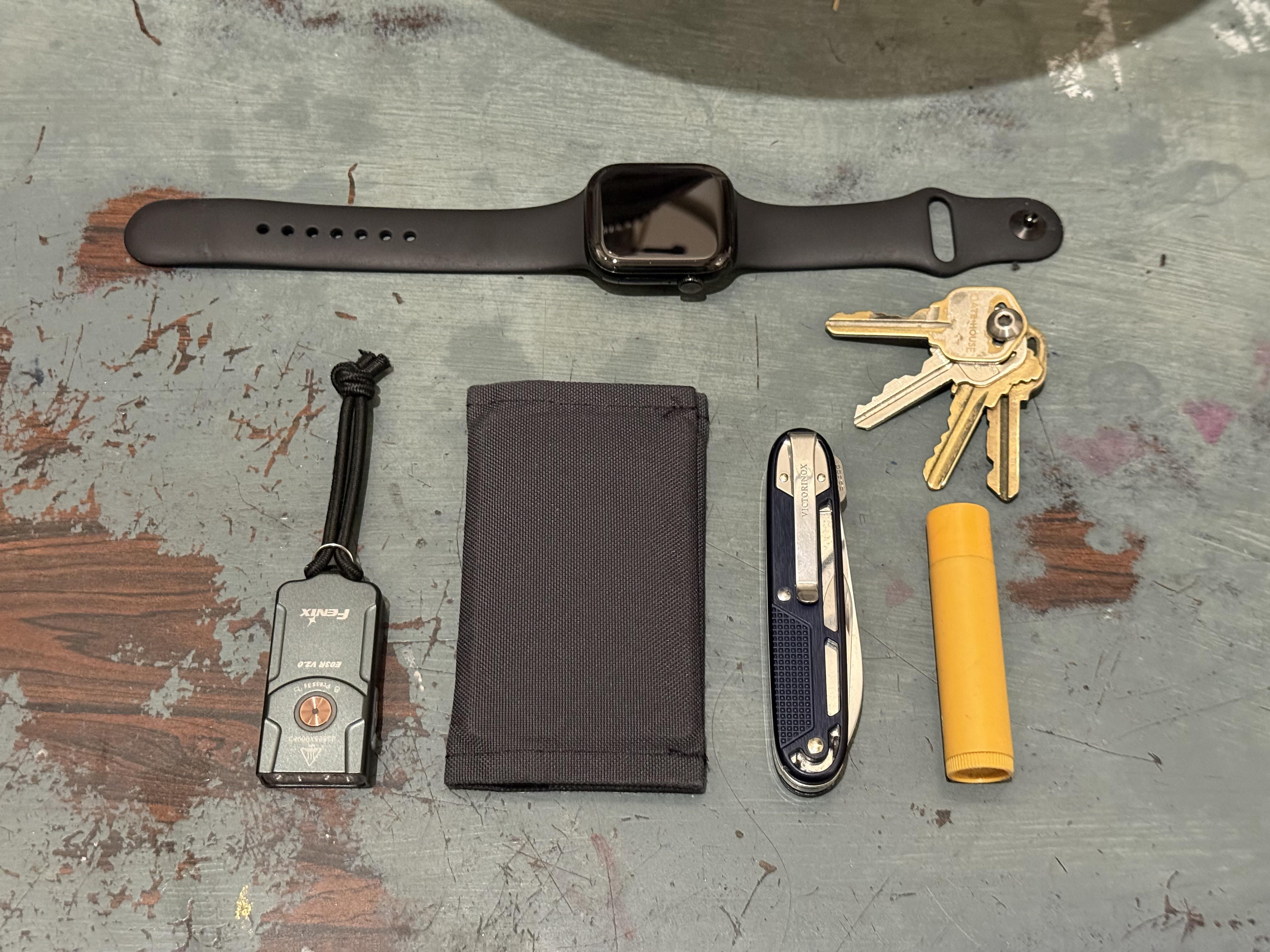 On my person at all times. Bigger EDC pouch in my bag. I run a softgoods brand/factory.