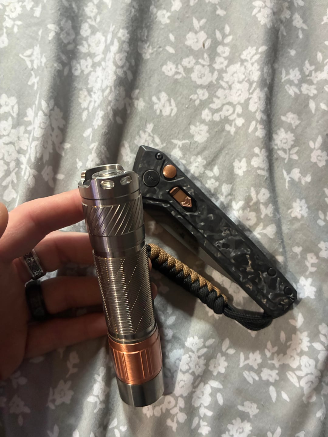 This little beauty arrived yesterday and man I’m impressed like usual by Simon. This is the S21G Titanium and copper host with an RS50 21700 battery. This one came with a high CRI SFT70 in 3000k and holy hell it’s stunning. I snagged the SC13 CU and fell in love with the emitter so I wanted that same light but in a bigger and more respectable host. The nighttime color rendition is top tier. Simon ended up hooking me up with an upgraded emitter from what I initially picked and I’m beyond grateful that he did as man it turned out just phenomenal. I was honestly kinda shocked by how much throw it had and was so pleasantly surprised. UI is a bit wonk but that’s such a small issue for me as I cannot get over how nice this light looks. This light has absolutely no business being as cheap as it is, I got this to my door for less than $60 USD… like what???? Thanks again Simon. You killed it like usual and I greatly appreciate your hard work and amazing lights!