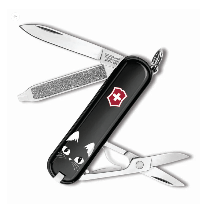 Hello everyone, I've been trying to find a small classic SD Swiss army knife in black with the logo in red. So far I've only found a black one with a black logo and a black one with the red logo but with cats on it (the picture). My father used to have one like that when he was young; he gifted it to me when I was a child and I lost it.