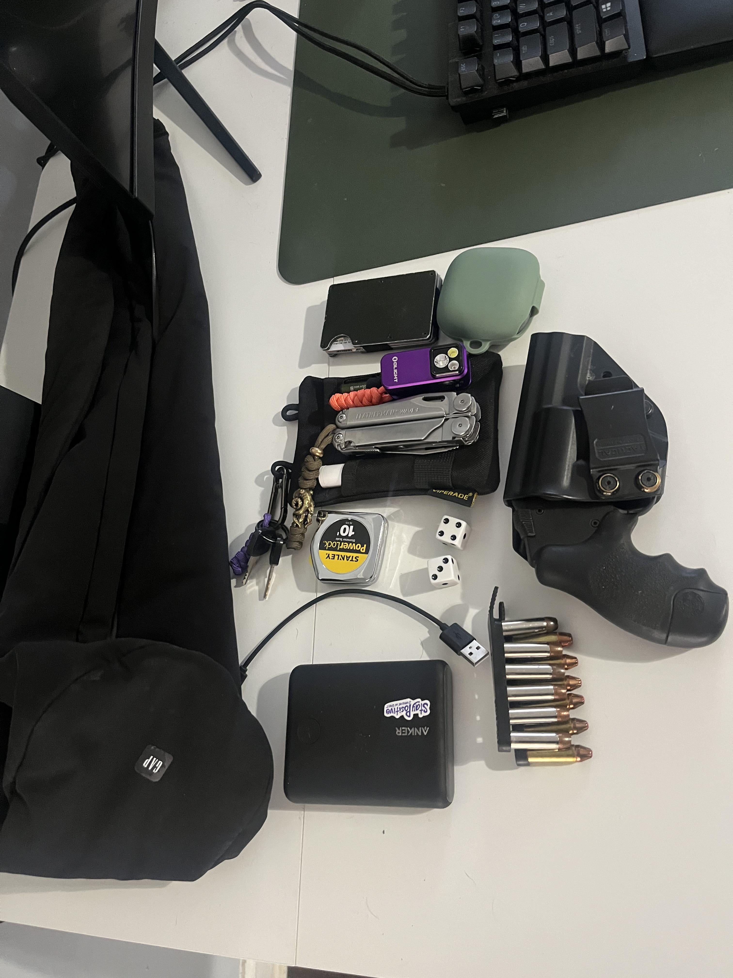 Yeezy snake bag, anker Nintendo portable charger S&W38spl p+ bodyguard,leatherman wave+ ,gun safe keys depending on wich car I drive that day, power beats bro