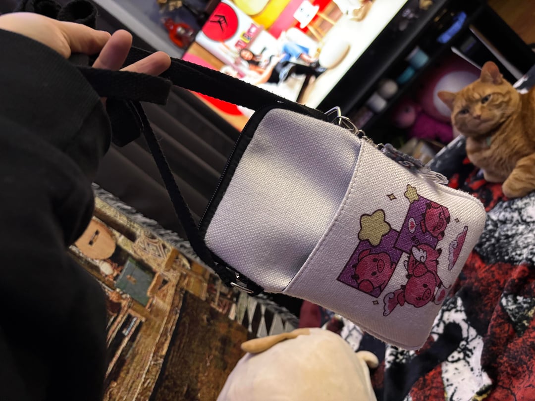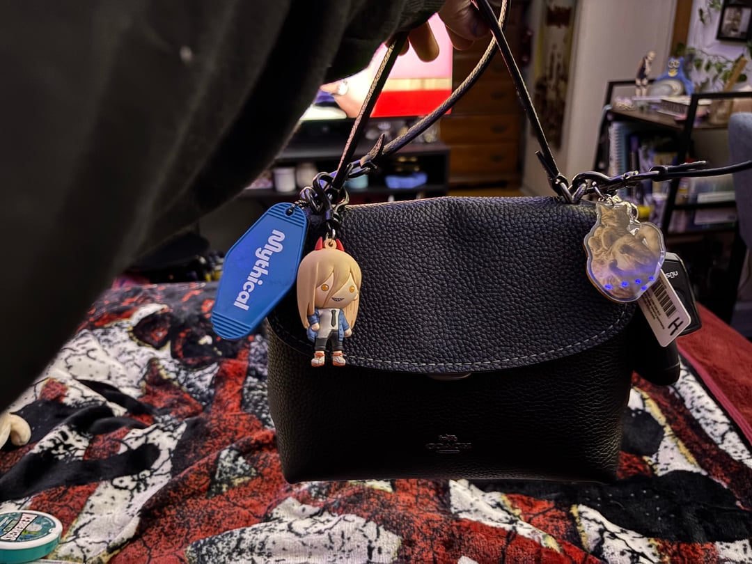 In the black bag, two pads, a plastic baggy with different earrings, gum, alka seltzer, two pens, wallet, travel container for meds, glasses case, lotion, baggy of hair ties and an emergen-c. In my white bag, airpods, work keys, mints, chapstick and lotion.