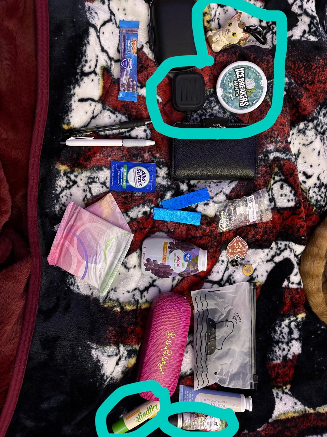 Not pictured because I forgot a pocket: Nail clippers and my w**d pens. Circled the items that go into my little white bag, everything else goes in the black bag. (Peep my cat lol)
