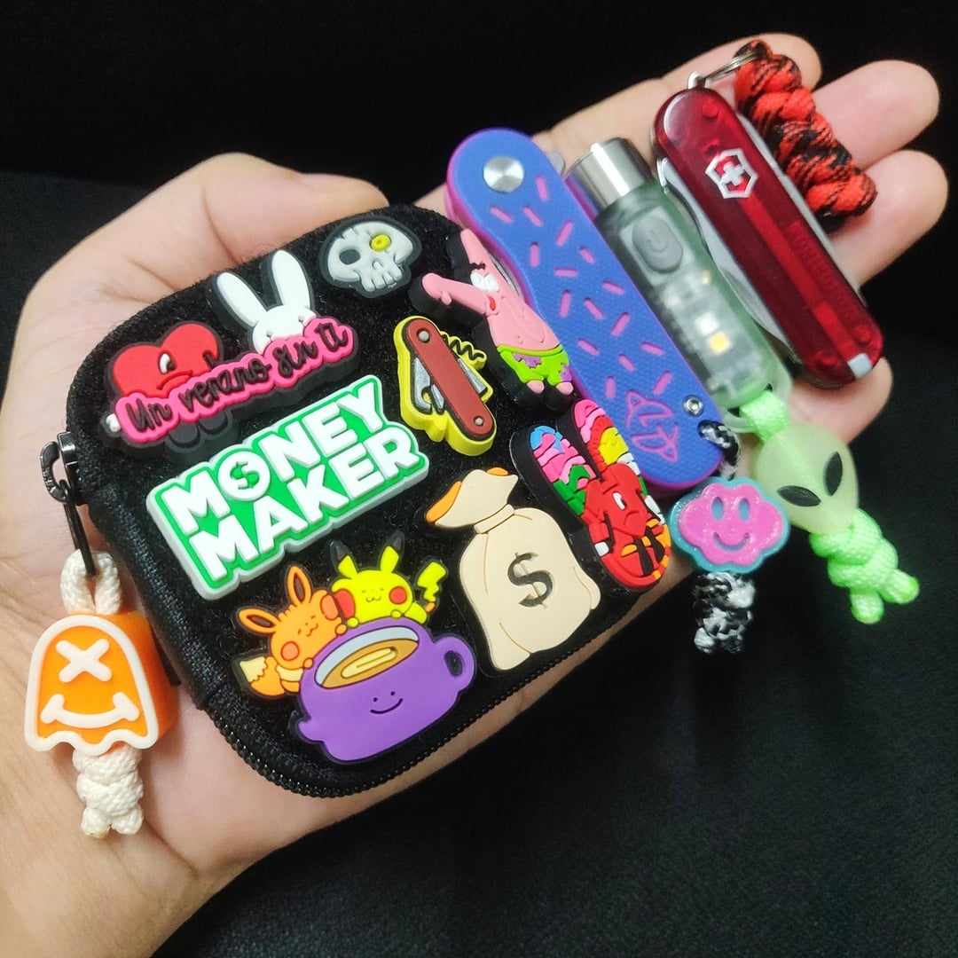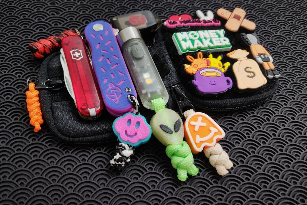 A colorful micro EDC setup featuring a custom pouch and a selection of compact everyday carry tools shown outside the pouch.